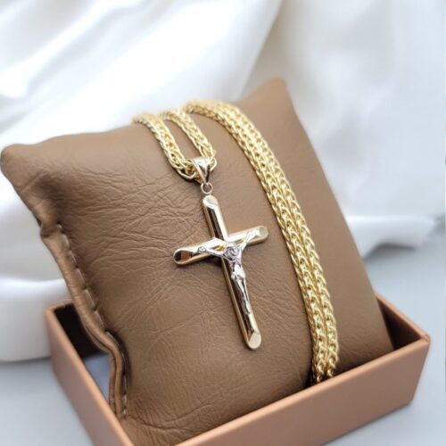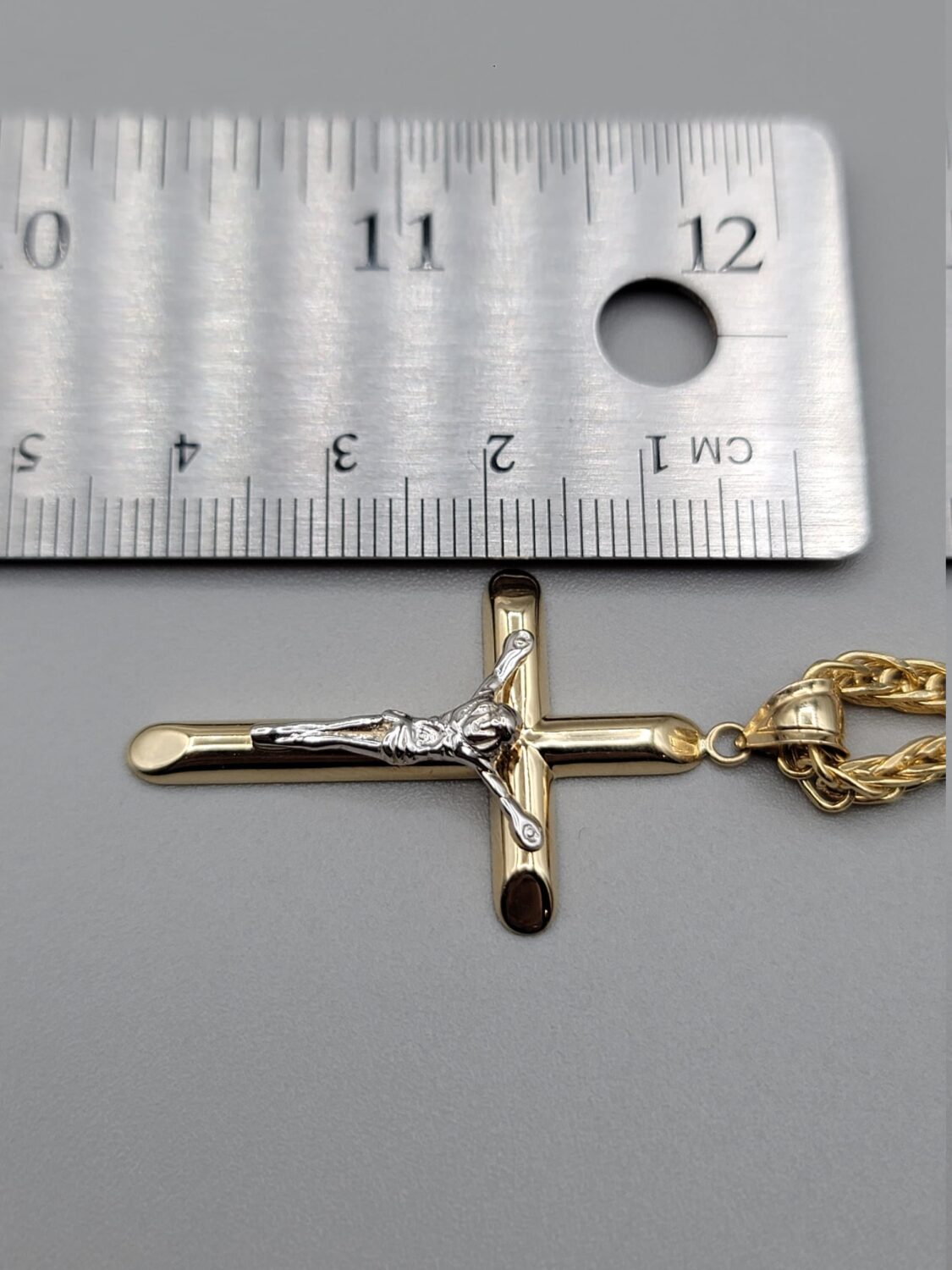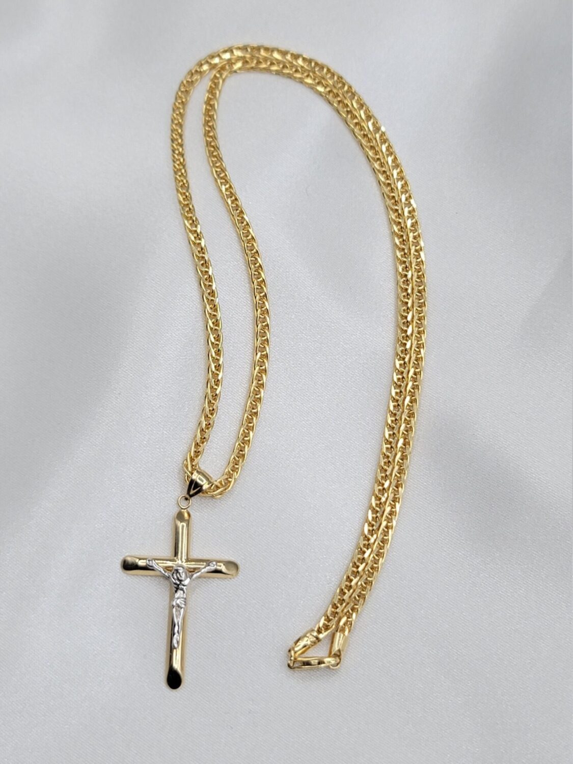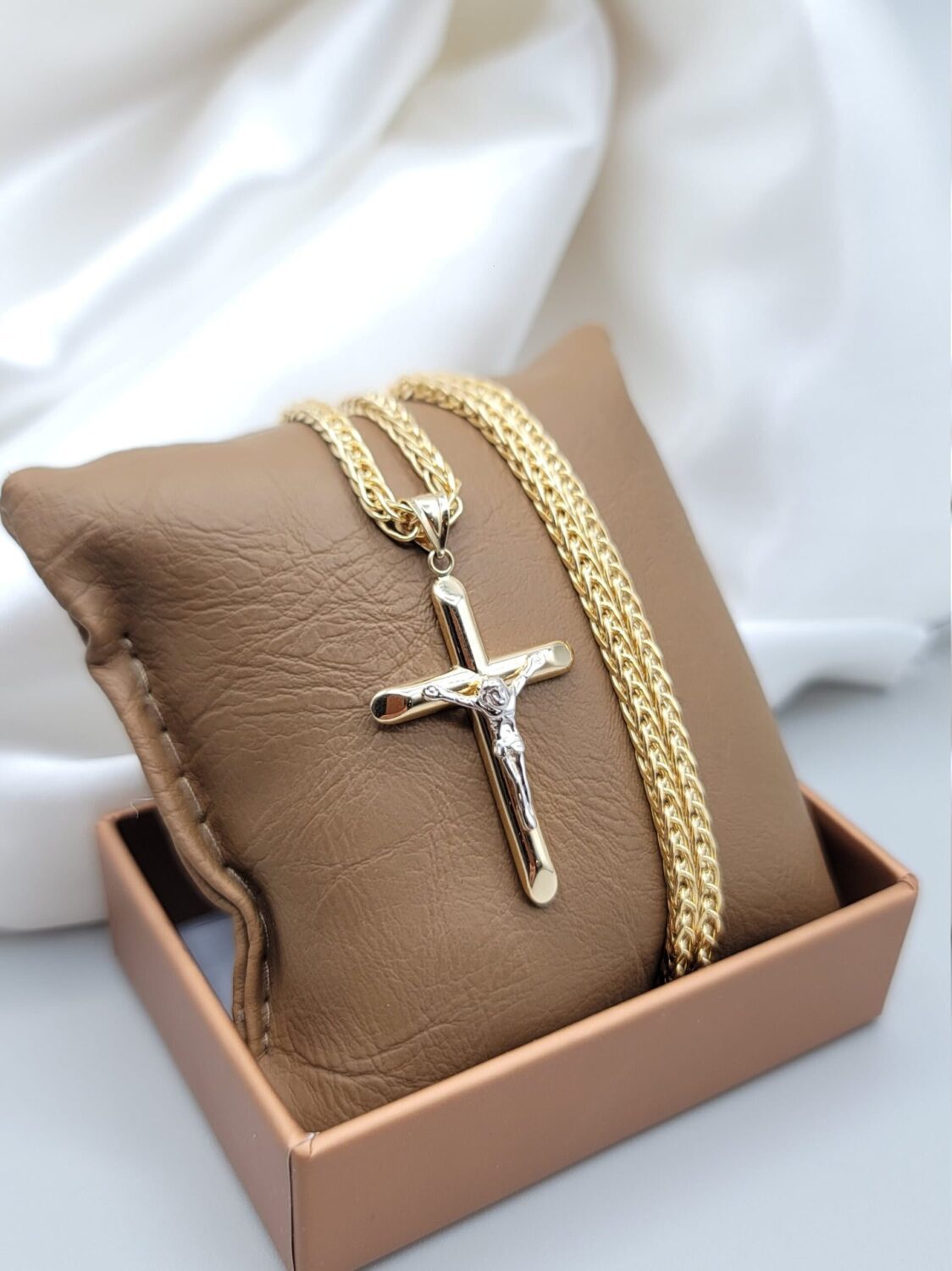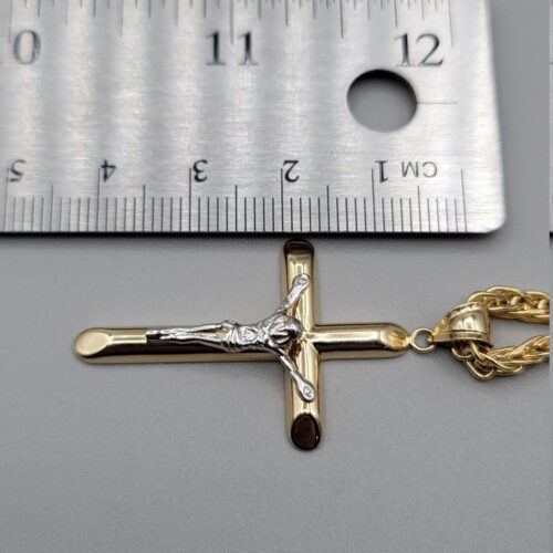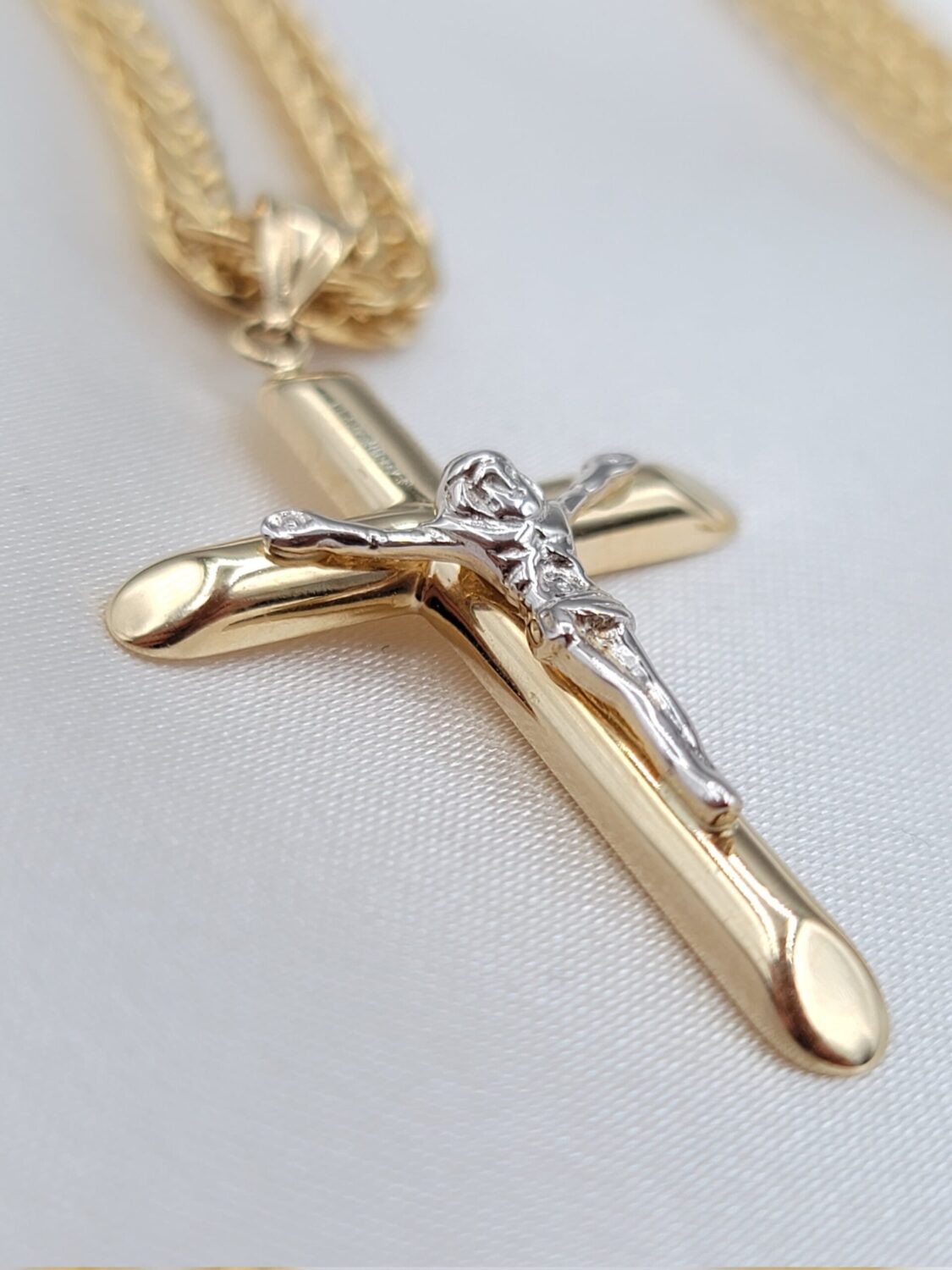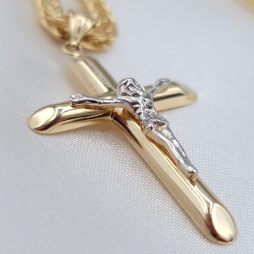 14K Genuine Solid Gold Jesus Cross Necklace. Franco Chain 21.5″, 3mm. White And Yellow Diamond Cut Jesus Cross Pendant. Gram Weight: 10.53gr