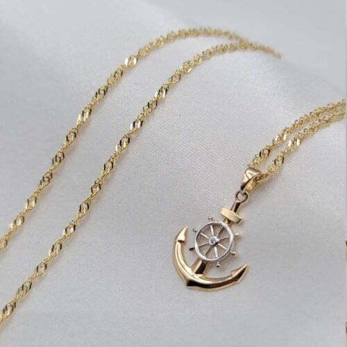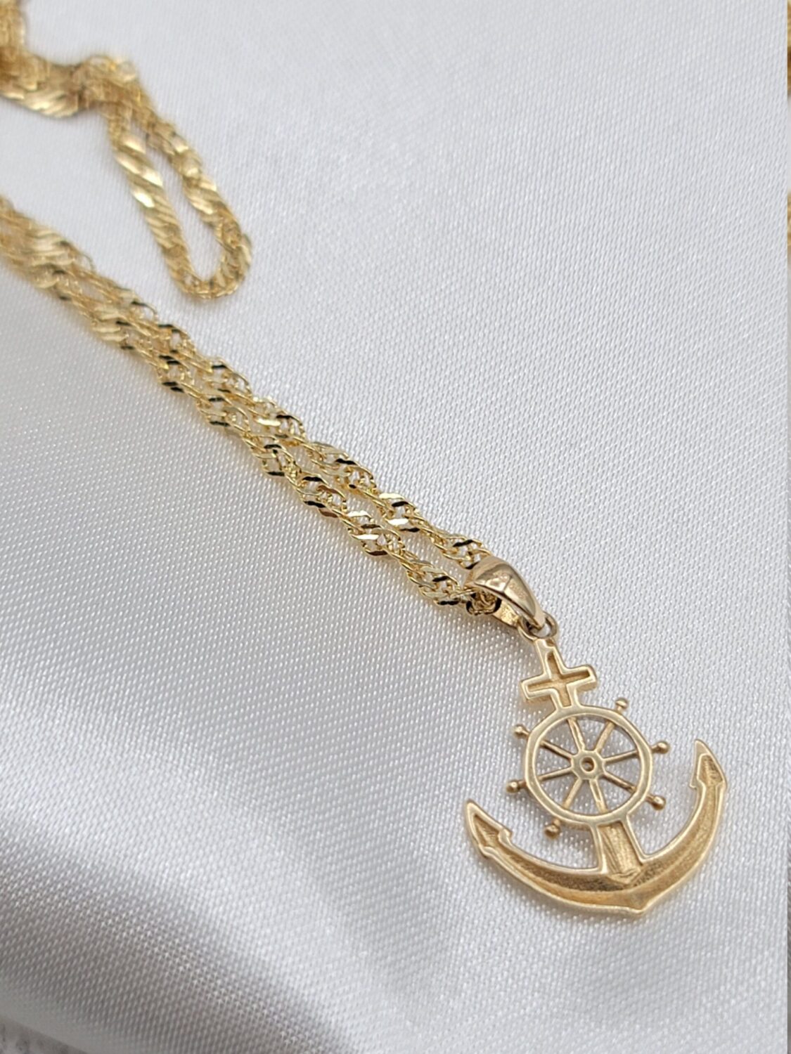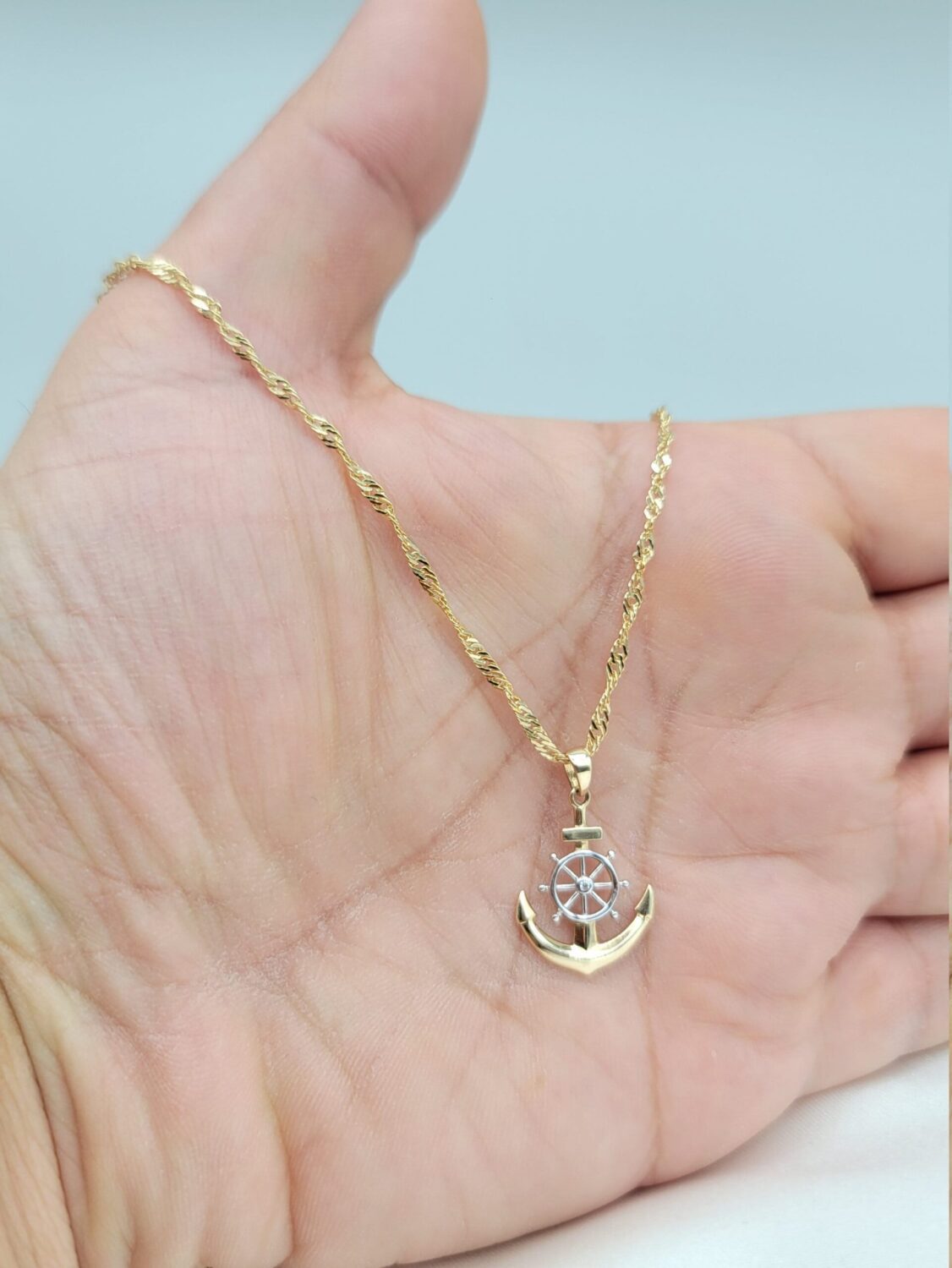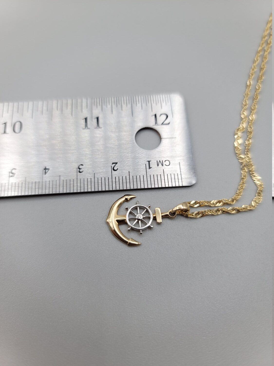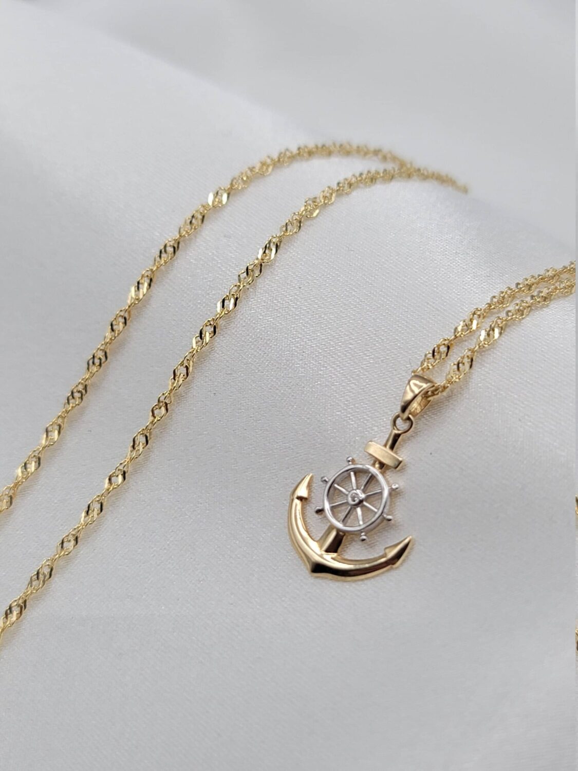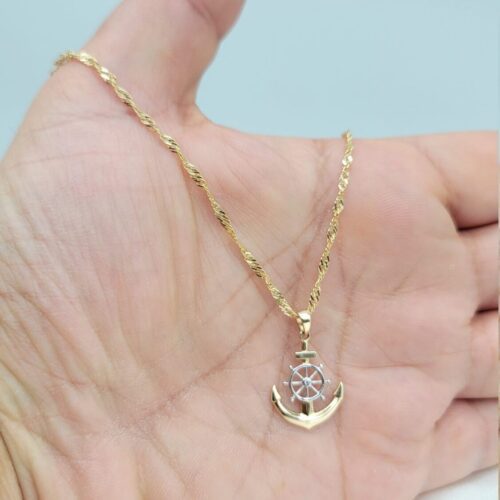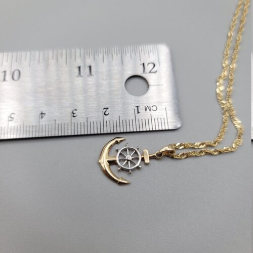14K Solid Gold Anchor Necklace. Unique Design With Ship Wheel. Singapore Chain 21 1/4″, 2mm. Unisex! Perfect Gift!