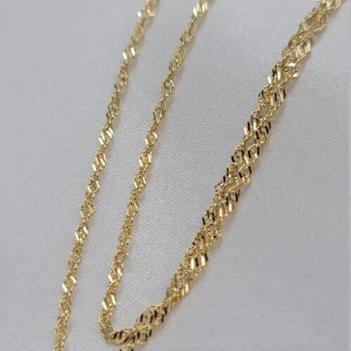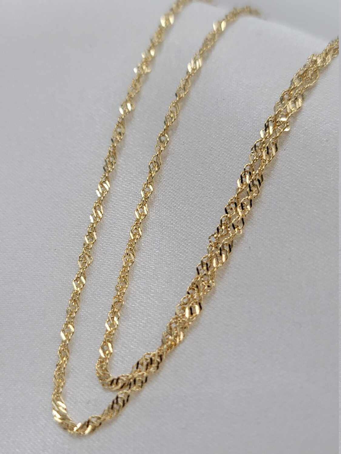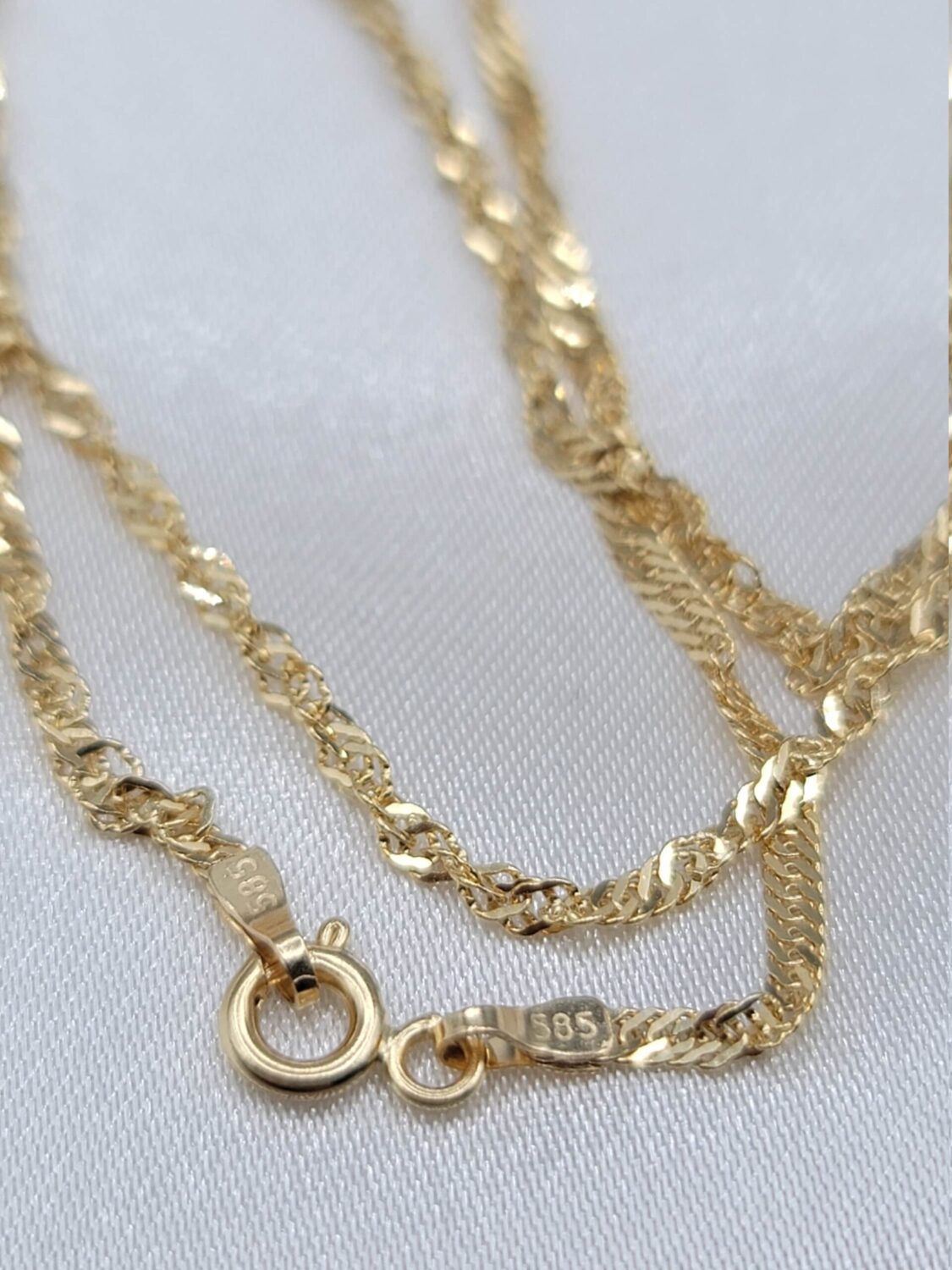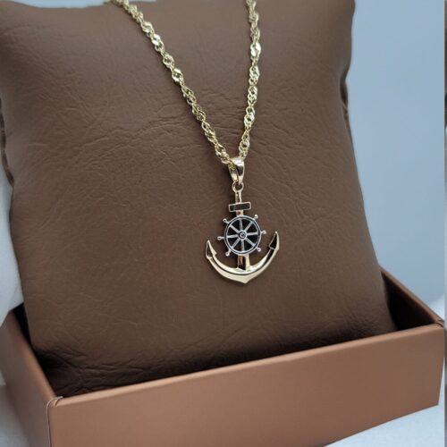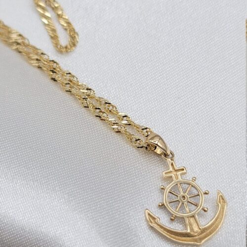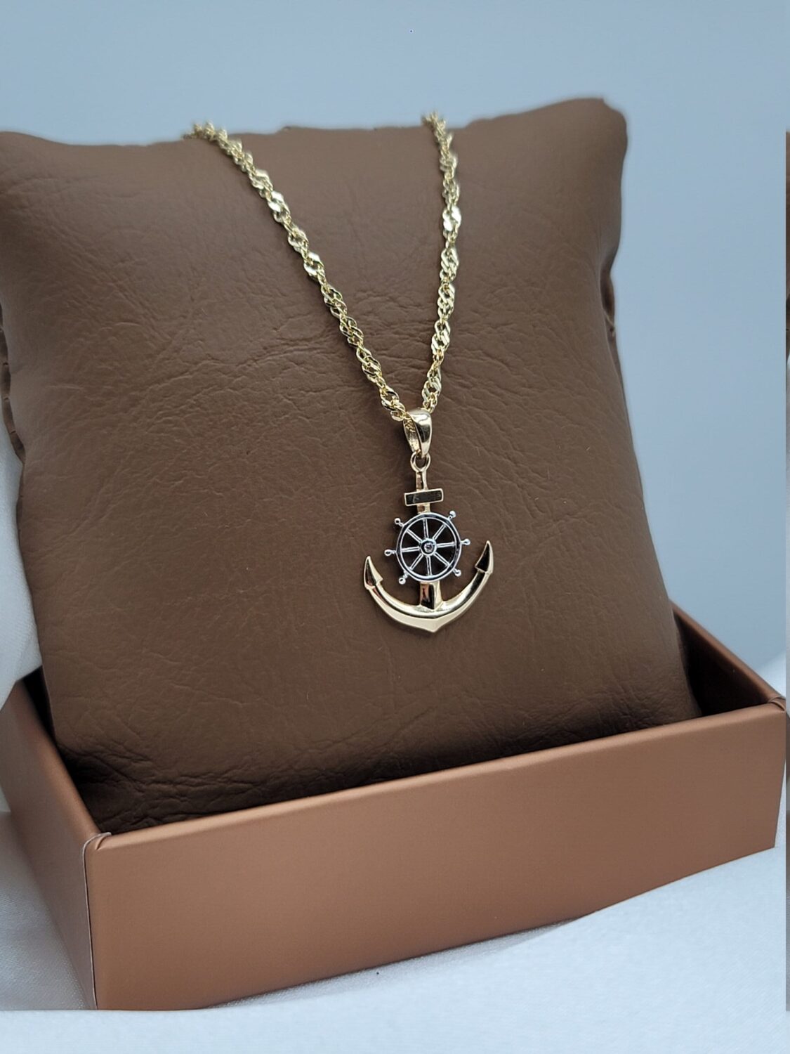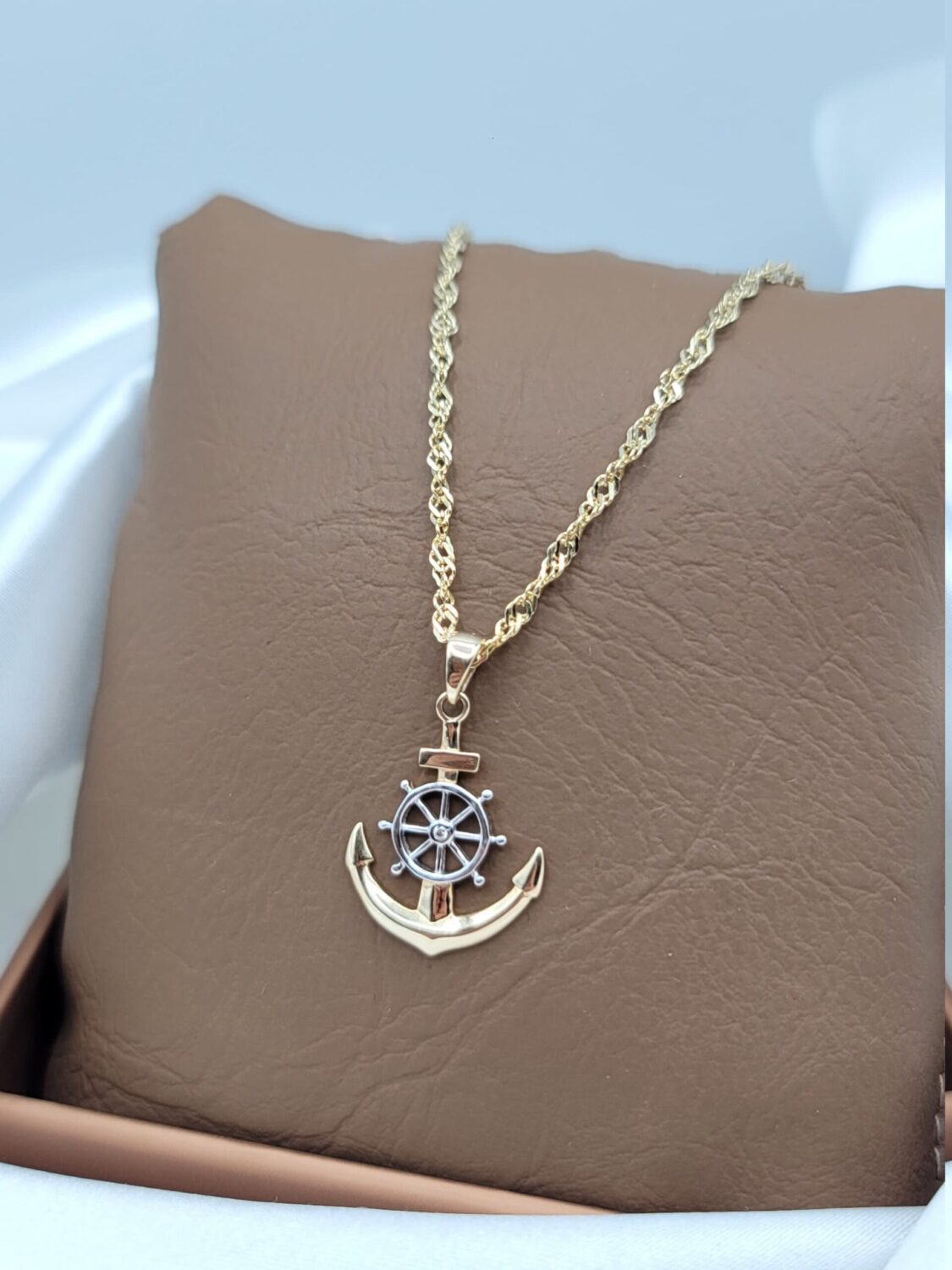 14K Solid Gold Anchor Necklace. Unique Design With Ship Wheel. Singapore Chain 21 1/4″, 2mm. Unisex! Perfect Gift!