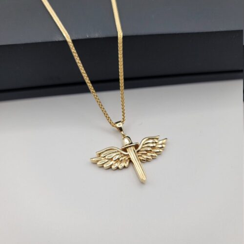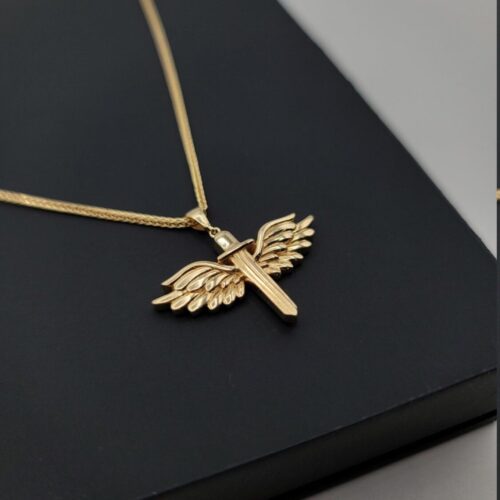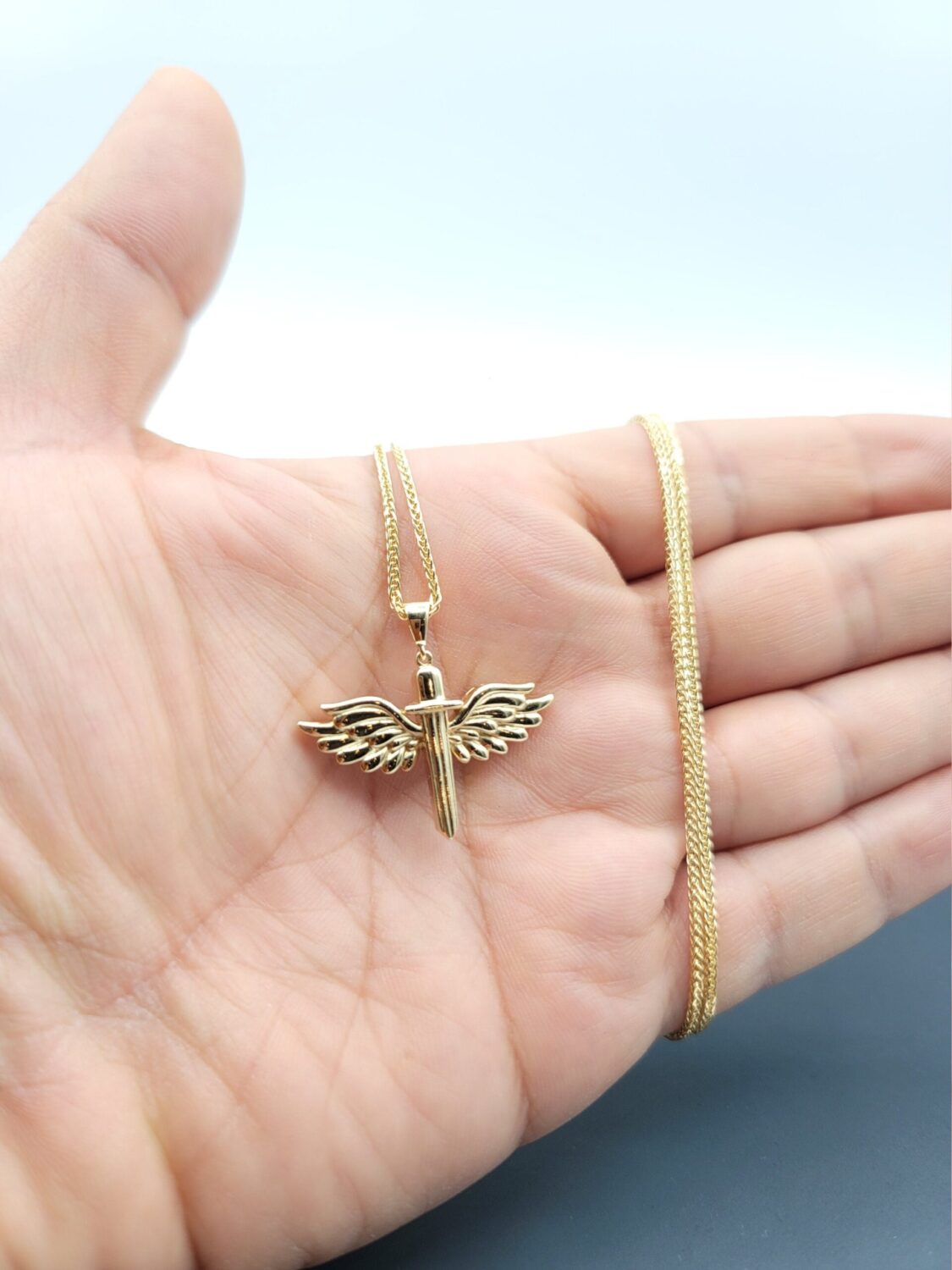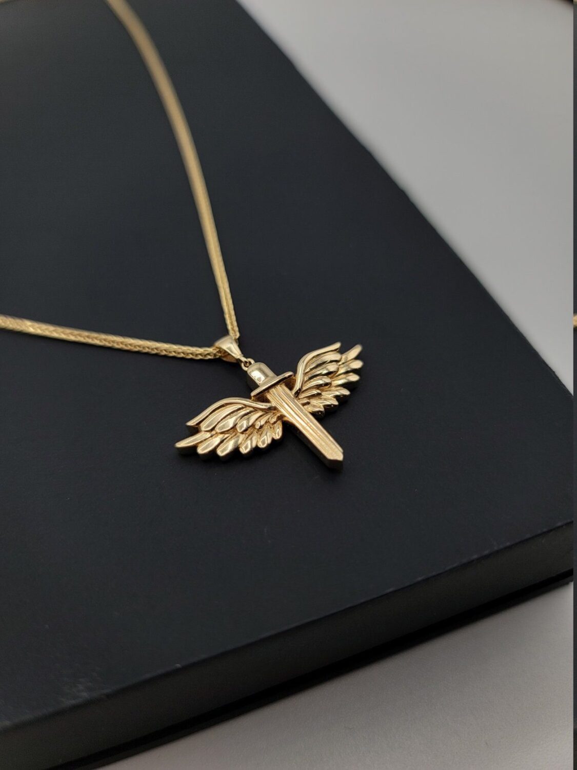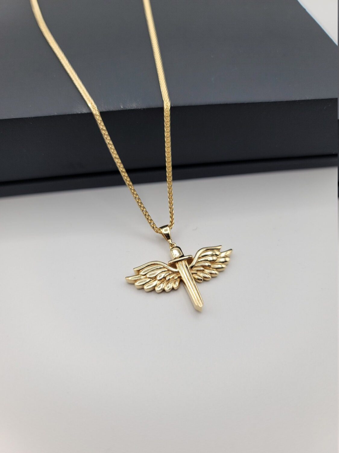 14K Solid Gold Foxtail Chain With Stylish Winged Sword Pendant. This Pendant Symbolizes For Strength, Courage and Valor. This Necklace is a Perfect Gift For The Hero in Your Life.