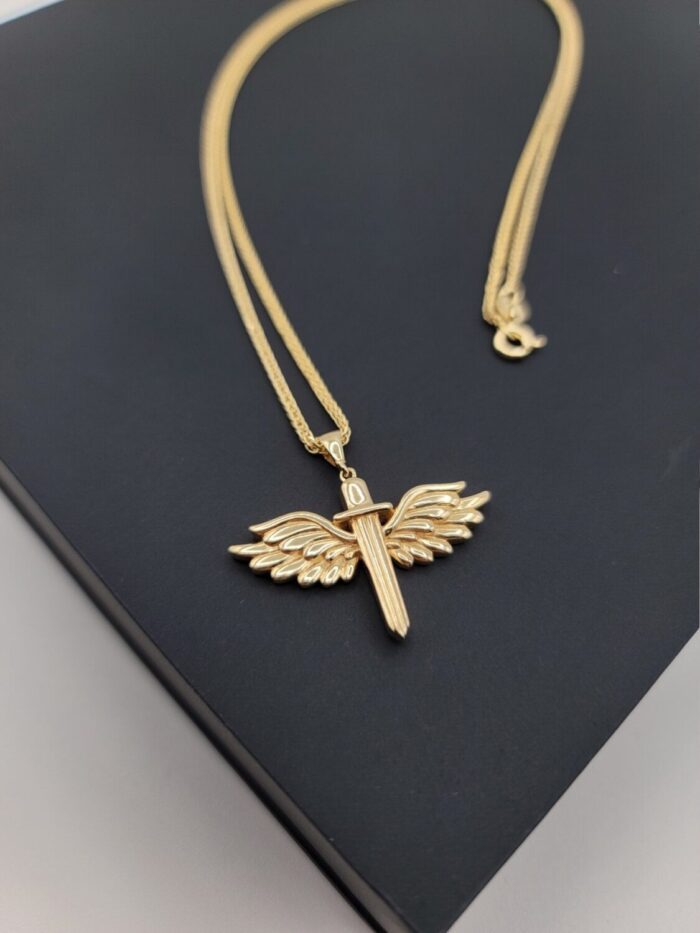 14K Solid Gold Foxtail Chain With Stylish Winged Sword Pendant. This Pendant Symbolizes For Strength, Courage and Valor. This Necklace is a Perfect Gift For The Hero in Your Life.