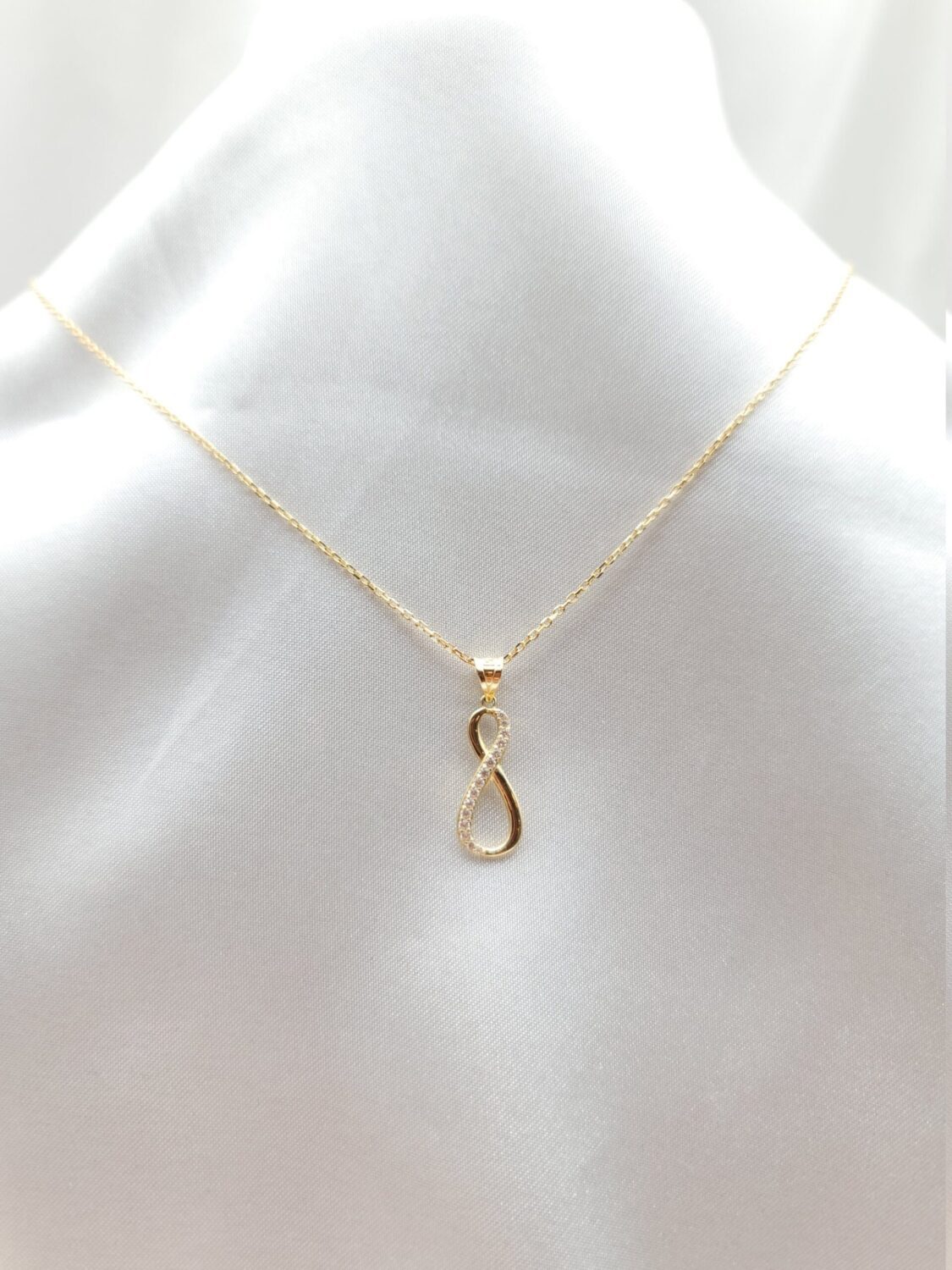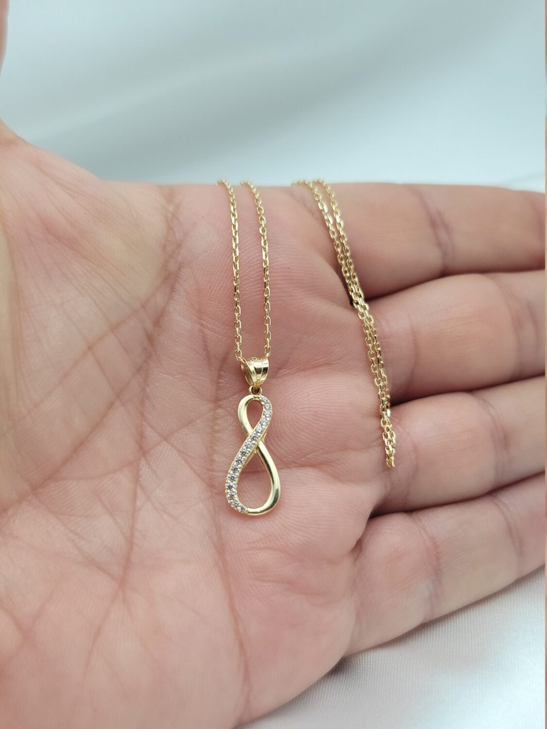 14K Solid Gold Infinity Necklace – 14K Dimond-Cut Cubic Zirconia Pendant centred with 17 3/4″ Flat Cable Chain – Gift For Her/Him!