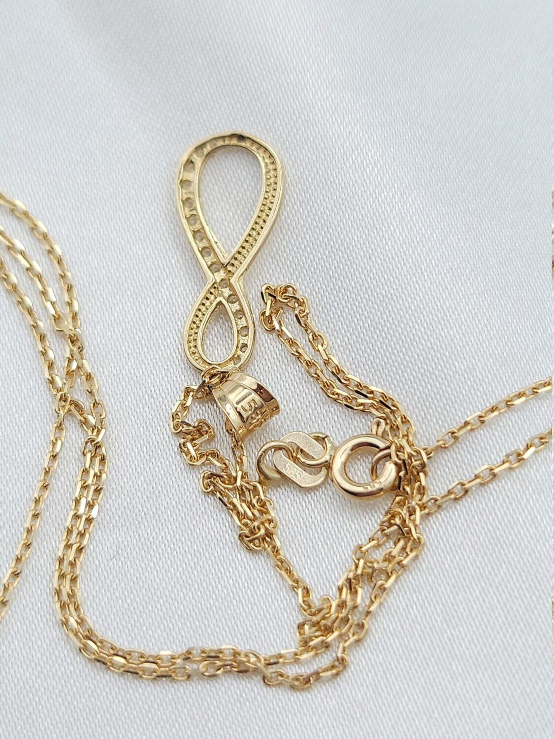 14K(585) Solid Gold Love Infiniti Necklace. Elegant and unique, this infinity pendant fits any occasion with ease. A diamond accent – artfully set to enhance size and sparkle – is nestled at the base. Buffed to a brilliant lustre, this pendant suspends along an 17 3/4-inch flat cable chain that secures with a spring-ring clasp.