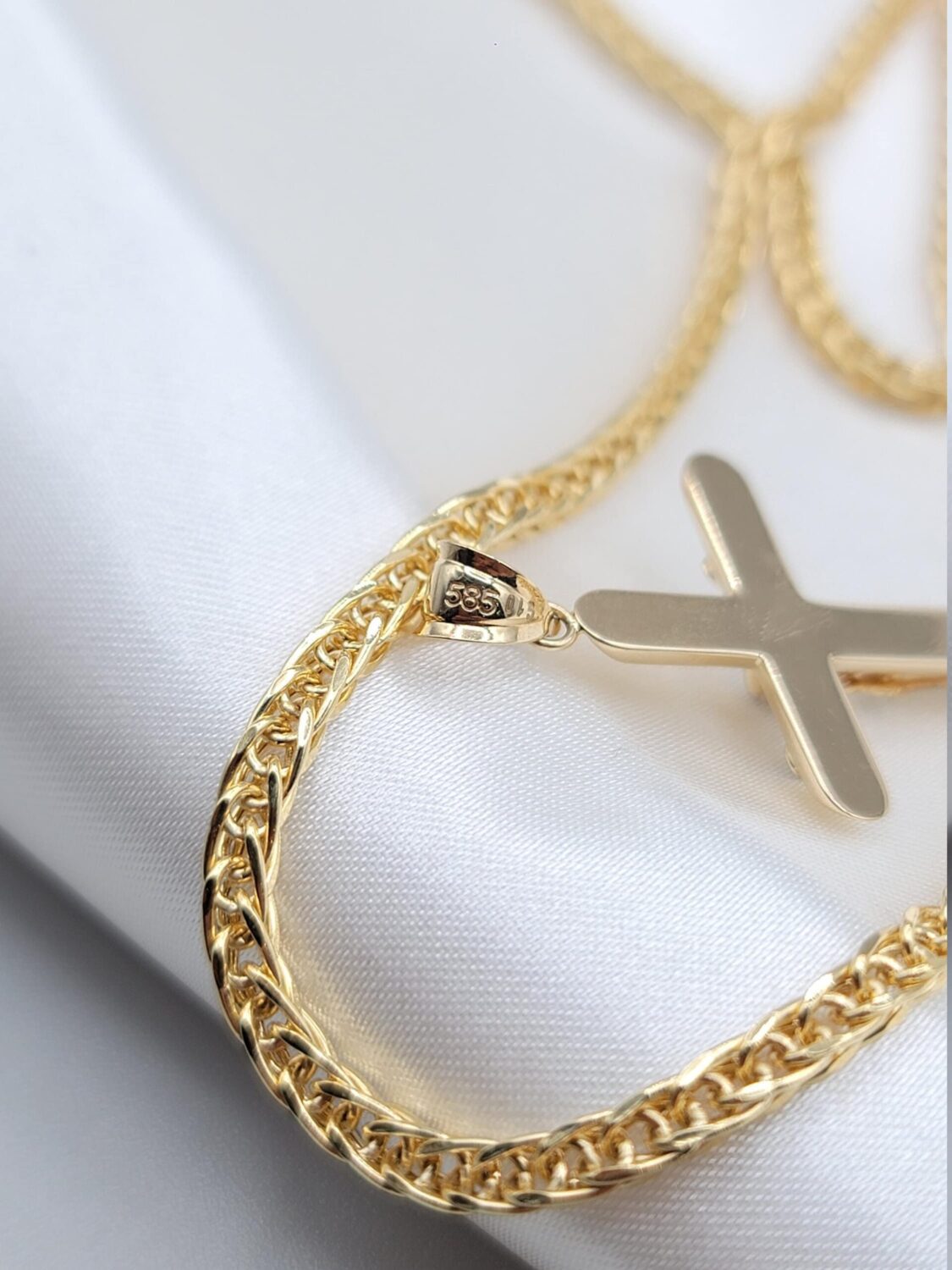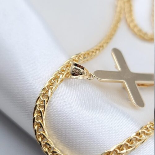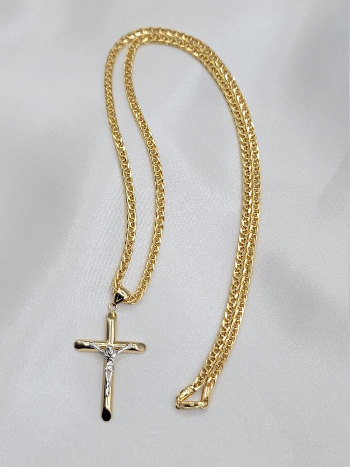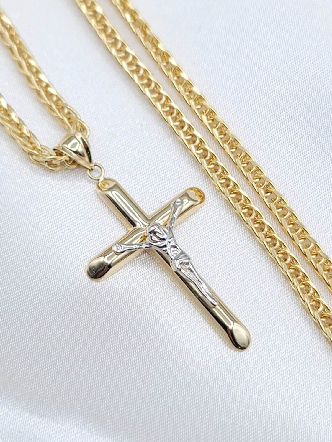 14K Solid Gold Jesus Cross Necklace. Franco Style Chain 21.5″, 3mm. White And Yellow Diamond Cut Cross Pendant. Gram Weight: 10.53gr