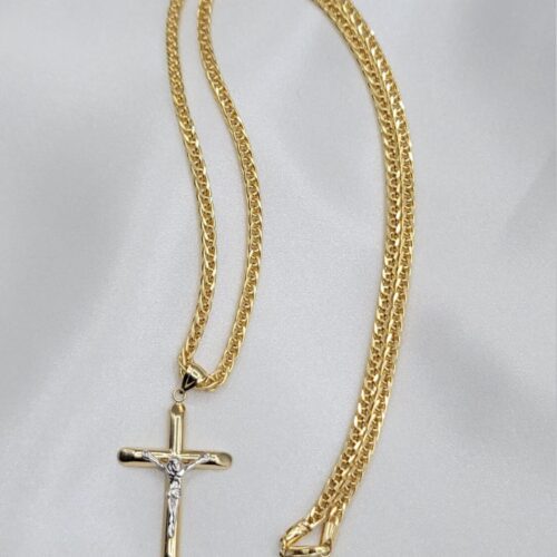Be the first to review “14K Solid Gold Jesus Cross Necklace. Franco Style Chain 21.5″, 3mm. White And Yellow Diamond Cut Cross Pendant. Gram Weight: 10.53gr”