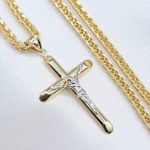 14K Genuine Solid Gold Jesus Cross Necklace. Franco Chain 21.5″, 3mm. White And Yellow Diamond Cut Jesus Cross Pendant. Gram Weight: 10.53gr