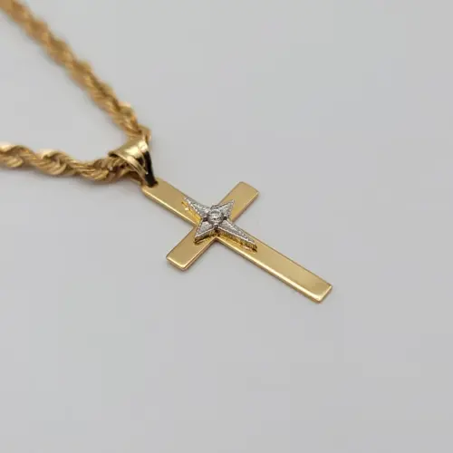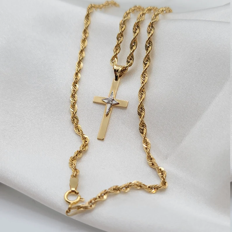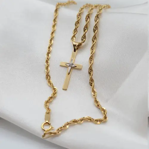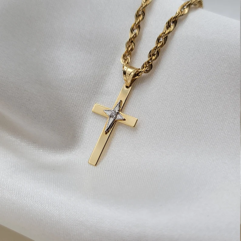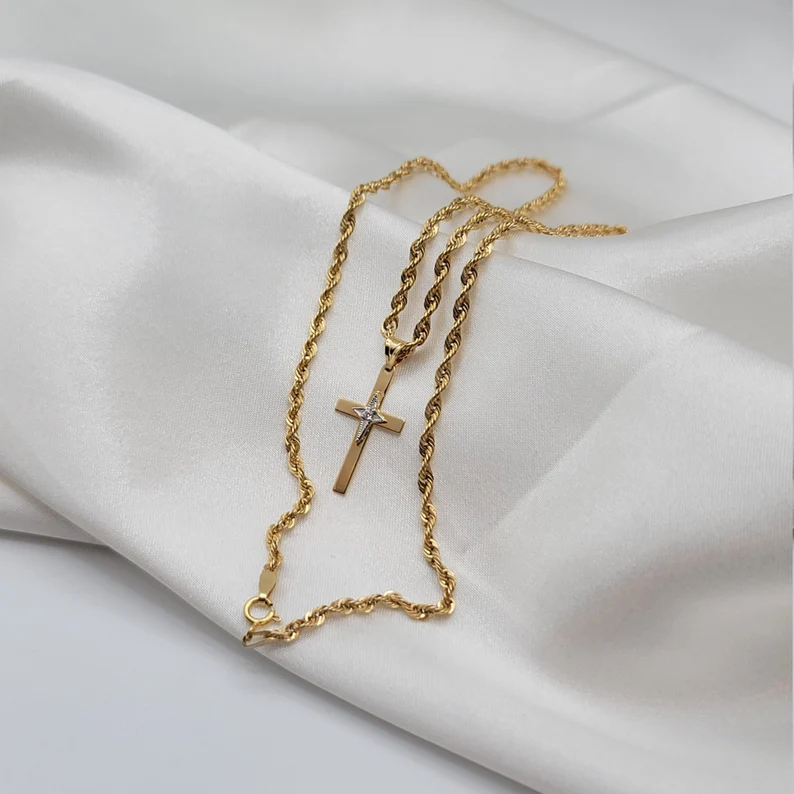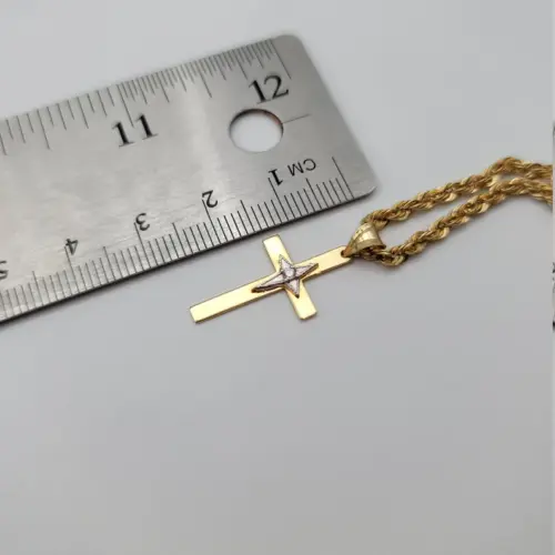 18-karat Solid Gold Cross Necklace – Diamond Cut Stone Pendant – 19.5″ Rope Chain -Jesus Cross Necklace in 18K Solid Gold, Prefect Gift!