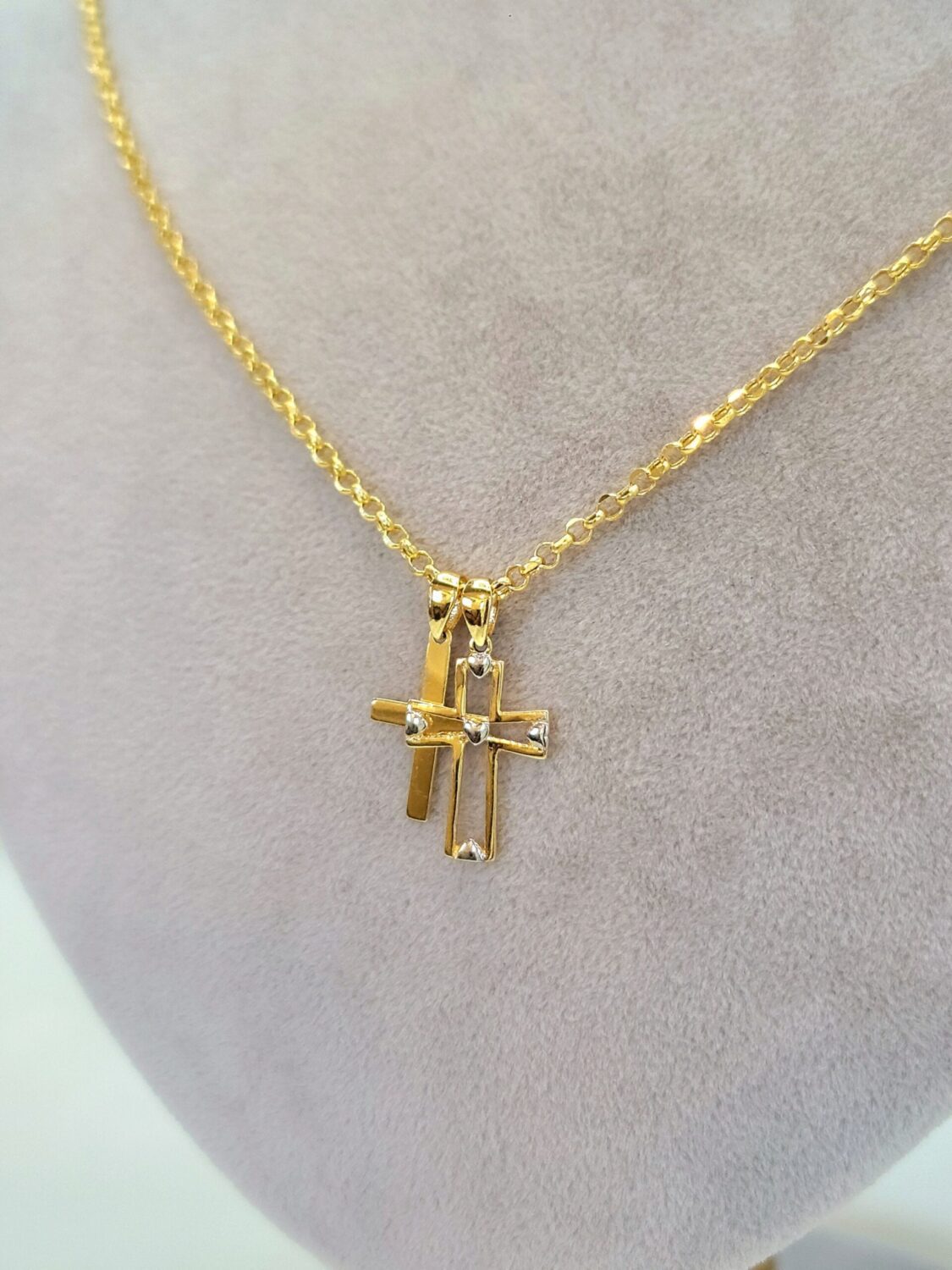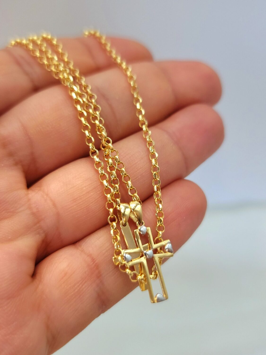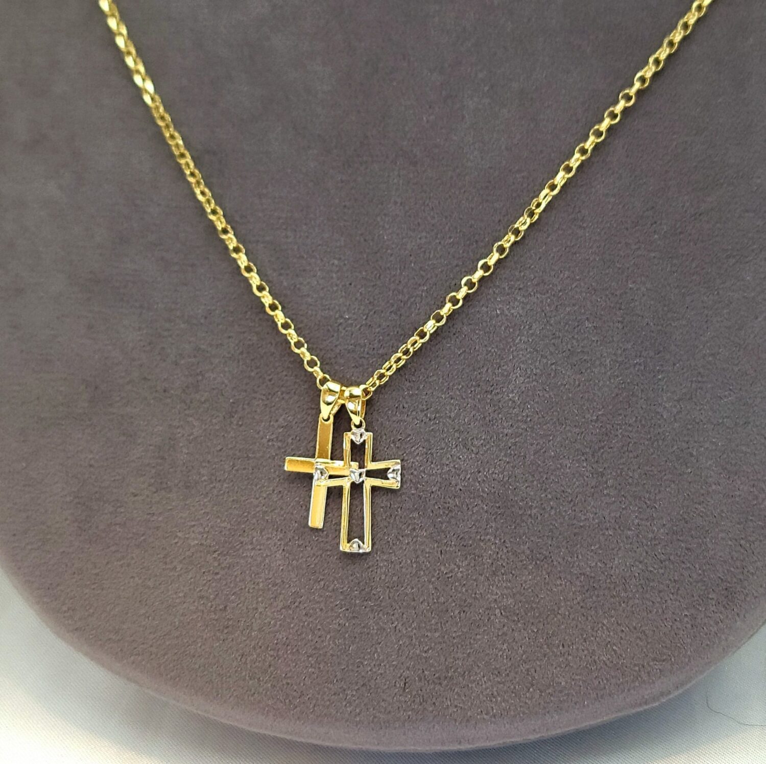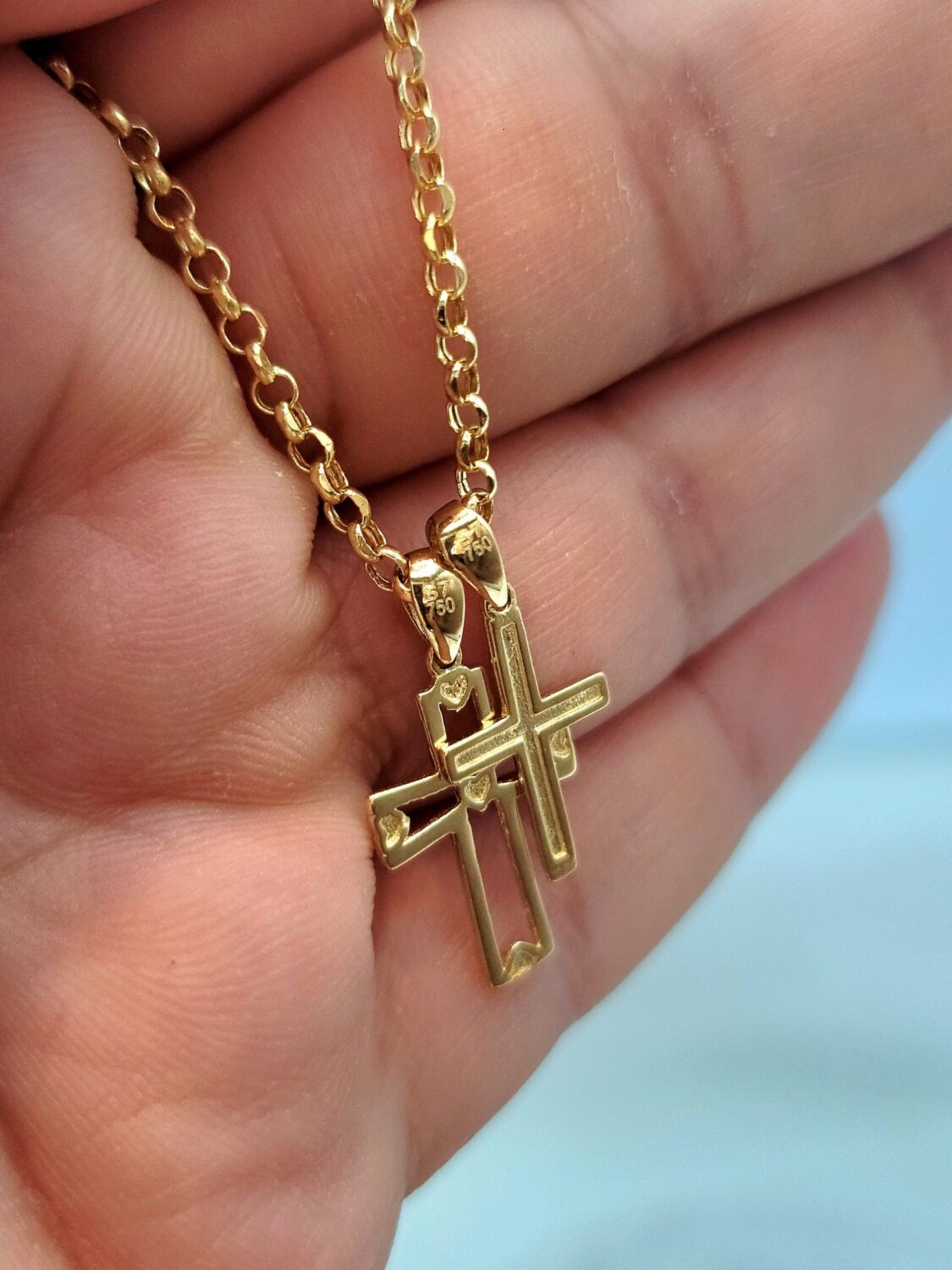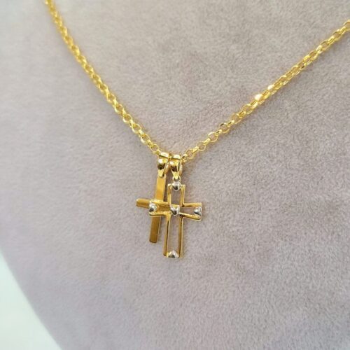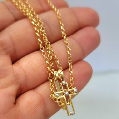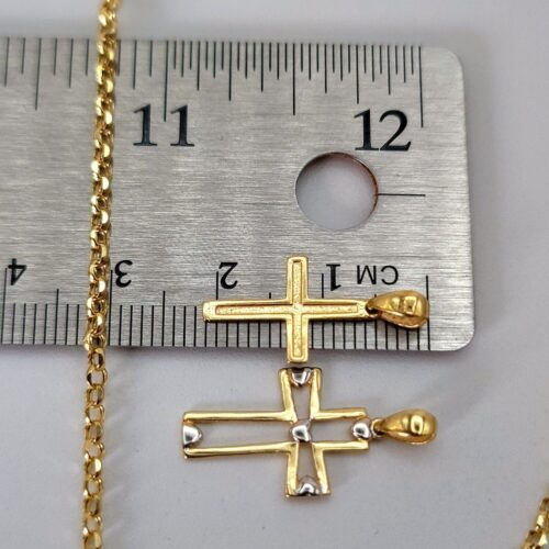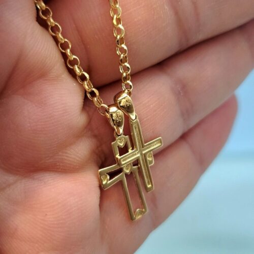 18K Cross Necklace/ 18K Solid Gold Double Cross Double Pendant Necklace/ 18K Solid Gold Rolo Chain/ Unisex 18K Cross Necklace/ Hot Style/ Birthday Gift/ Anniversary, Christmas Gift!