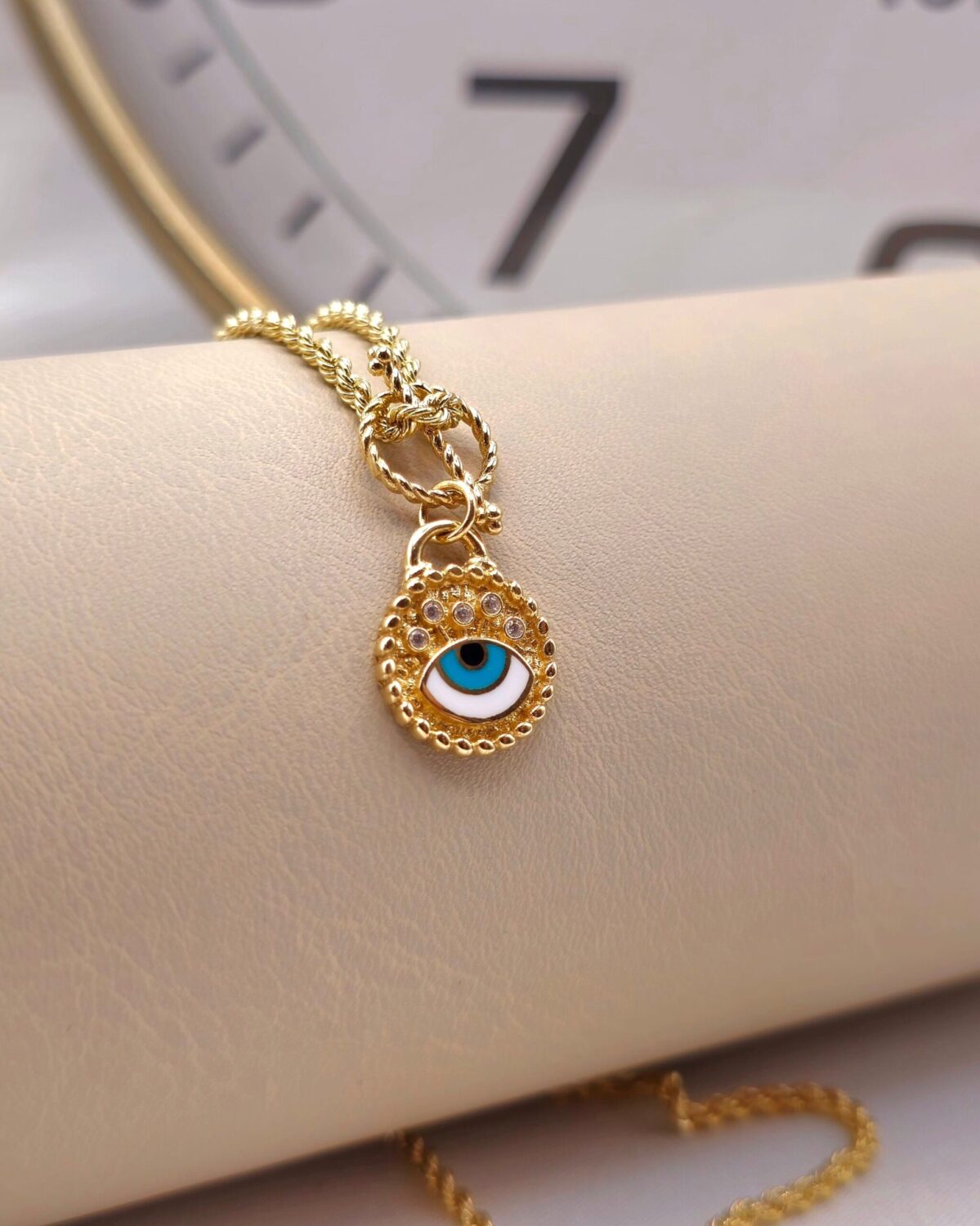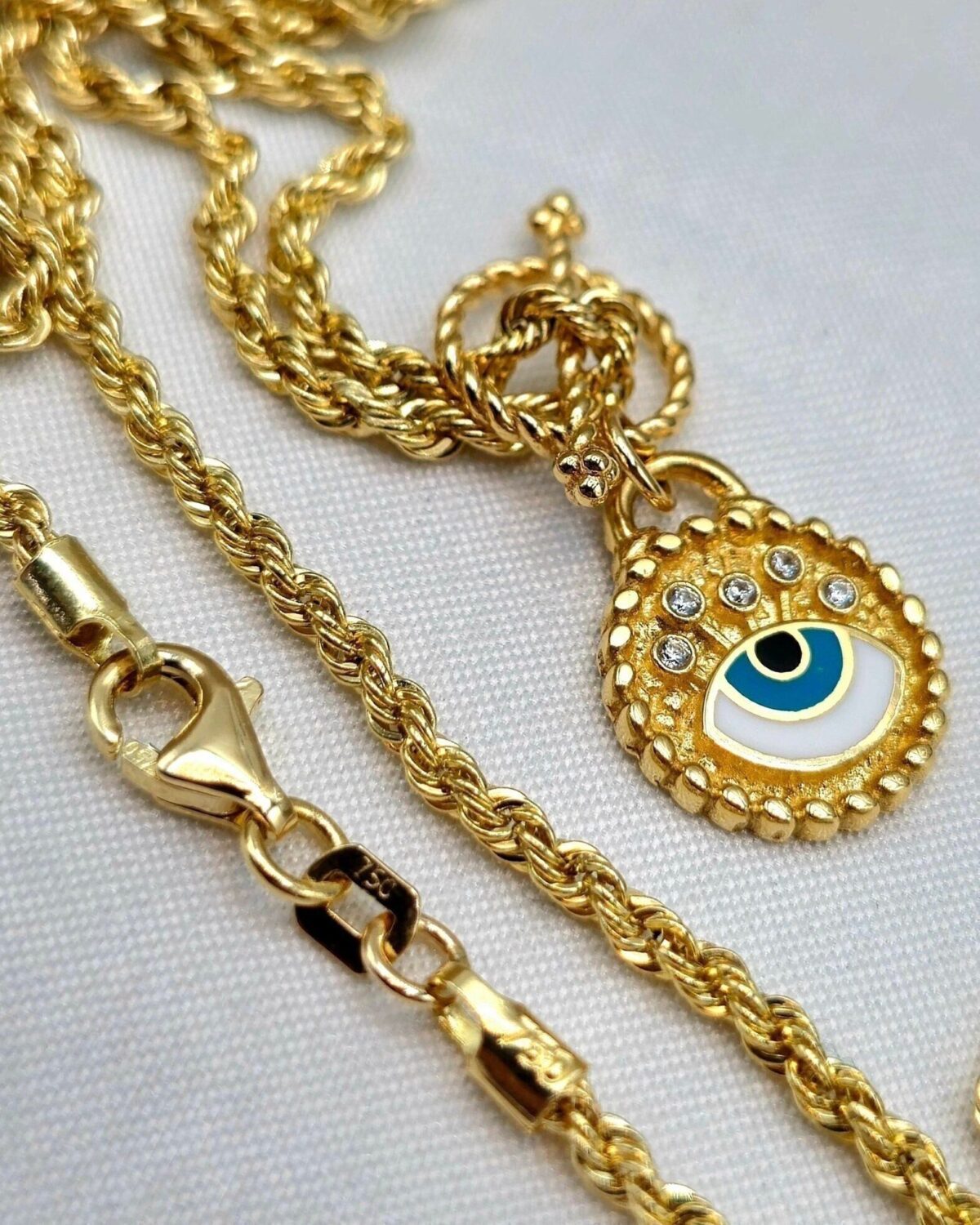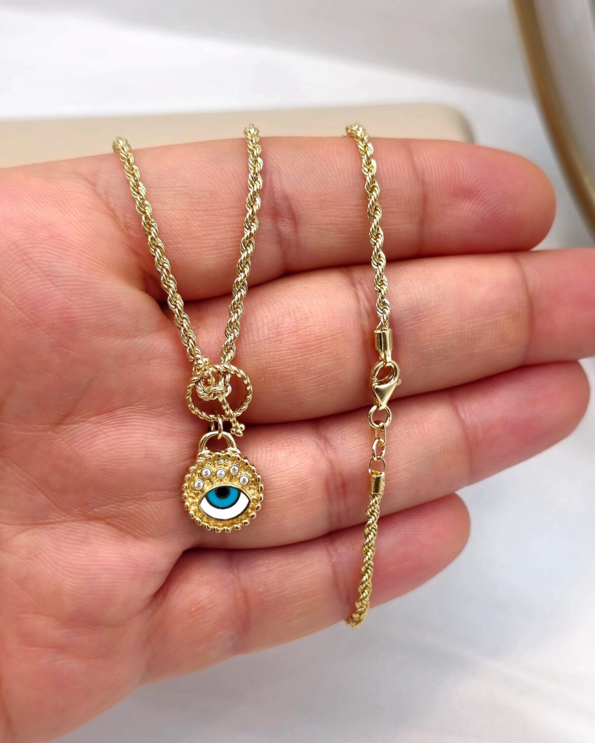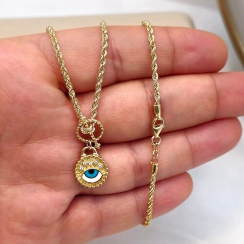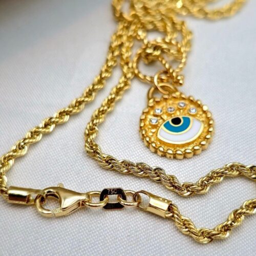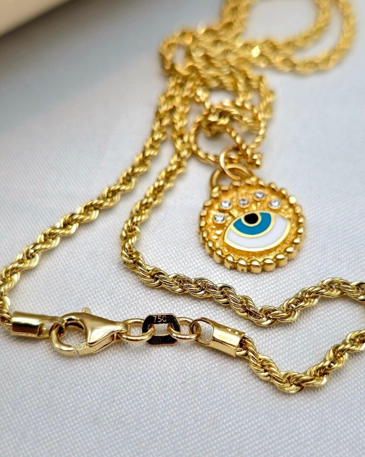 Protect yourself from negative energies with our stunning handcrafted authentic 18K gold evil eye pendant necklace. Intricate detailing enhances the elegance of this piece, making it a beautiful and meaningful gold jewelry accessory for everyday wear. A valuable gift idea for Mother’s day, Christmas, anniversaries, birthdays, or any occasion that deserves a touch of elegance and sophistication. The perfect gift for her! She’ll love it!