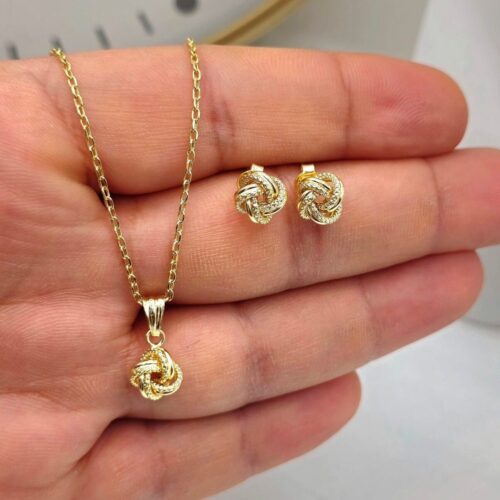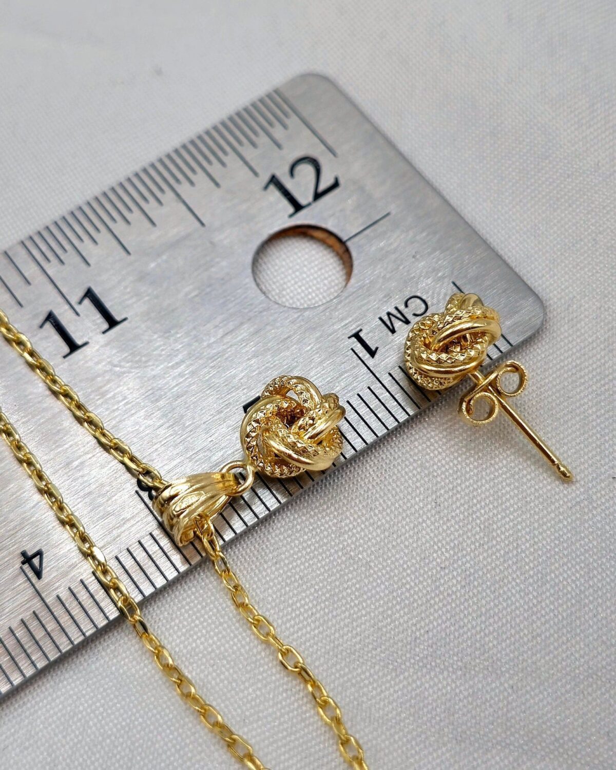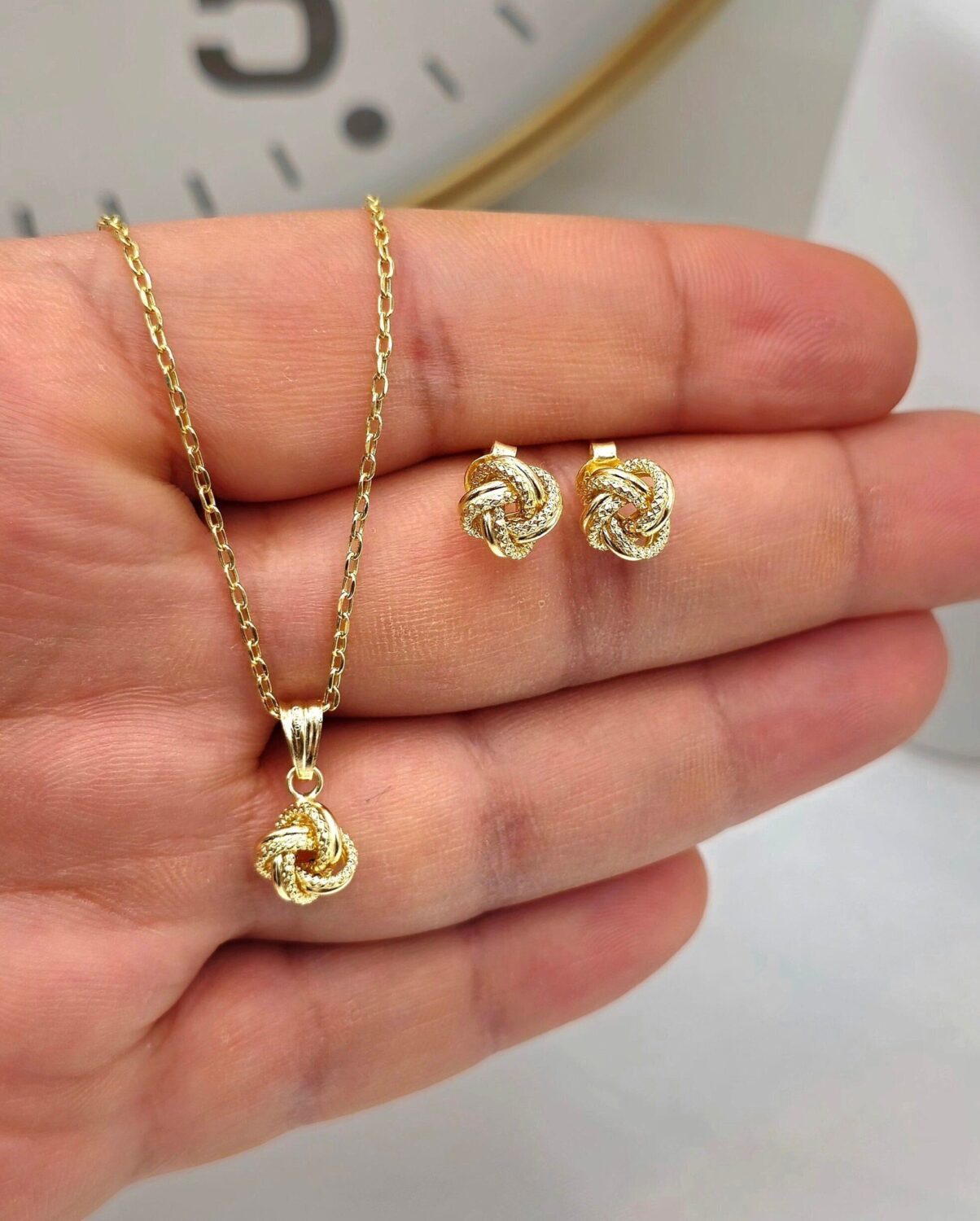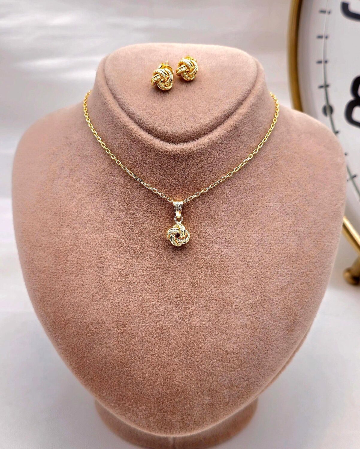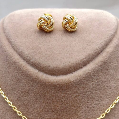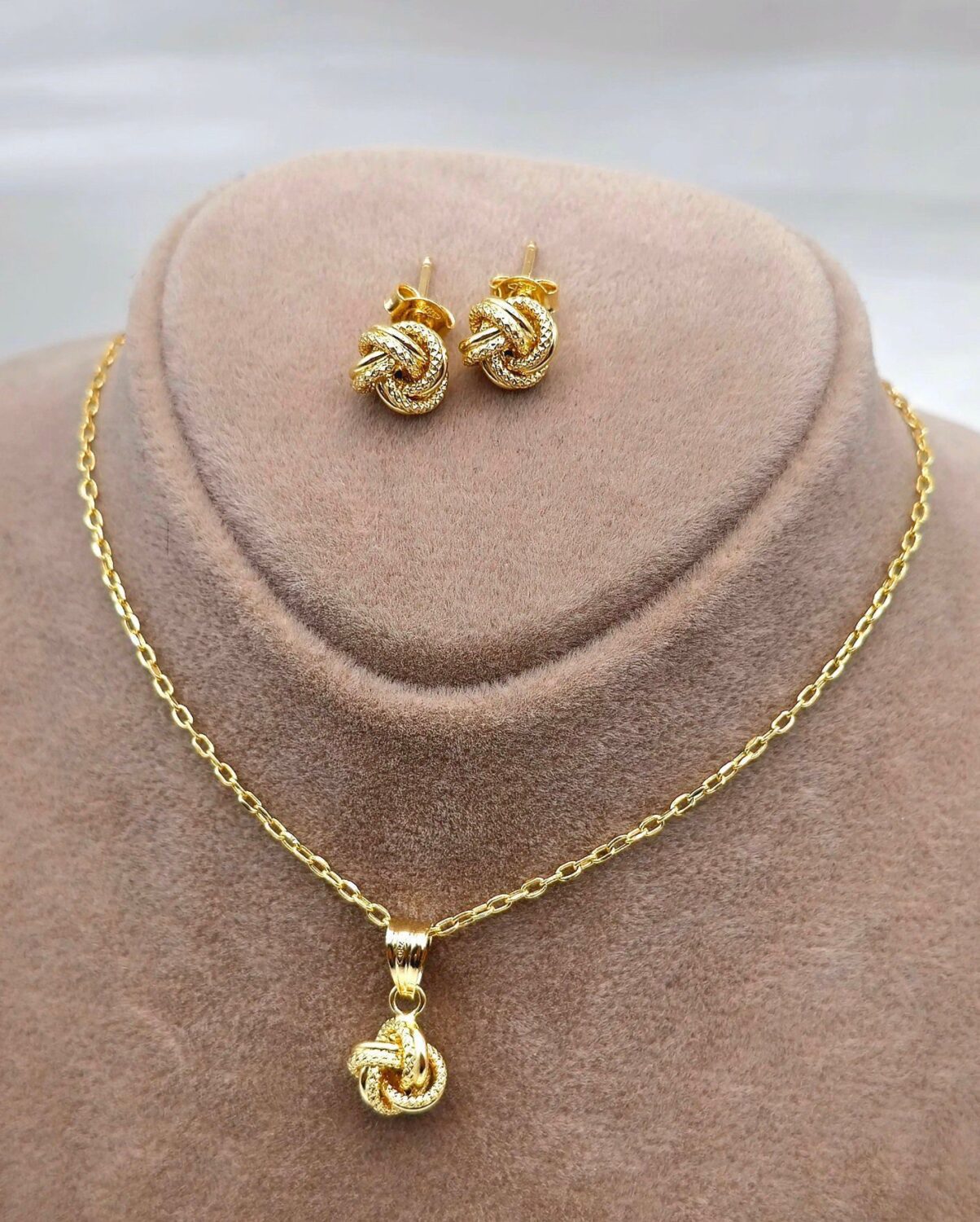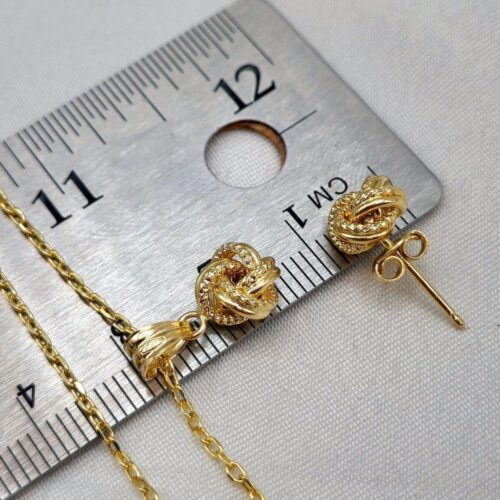 A stunning handcrafted authentic 18K gold half-set Love Knot necklace and earrings. Intricate detailing enhances the elegance of this piece, making it a beautiful and gorgeous accessory for everyday wear. A valuable gift idea for Weddings, Christmas, anniversaries, birthdays, or any occasion that deserves a touch of elegance and sophistication. The perfect gift for her! She’ll love it!