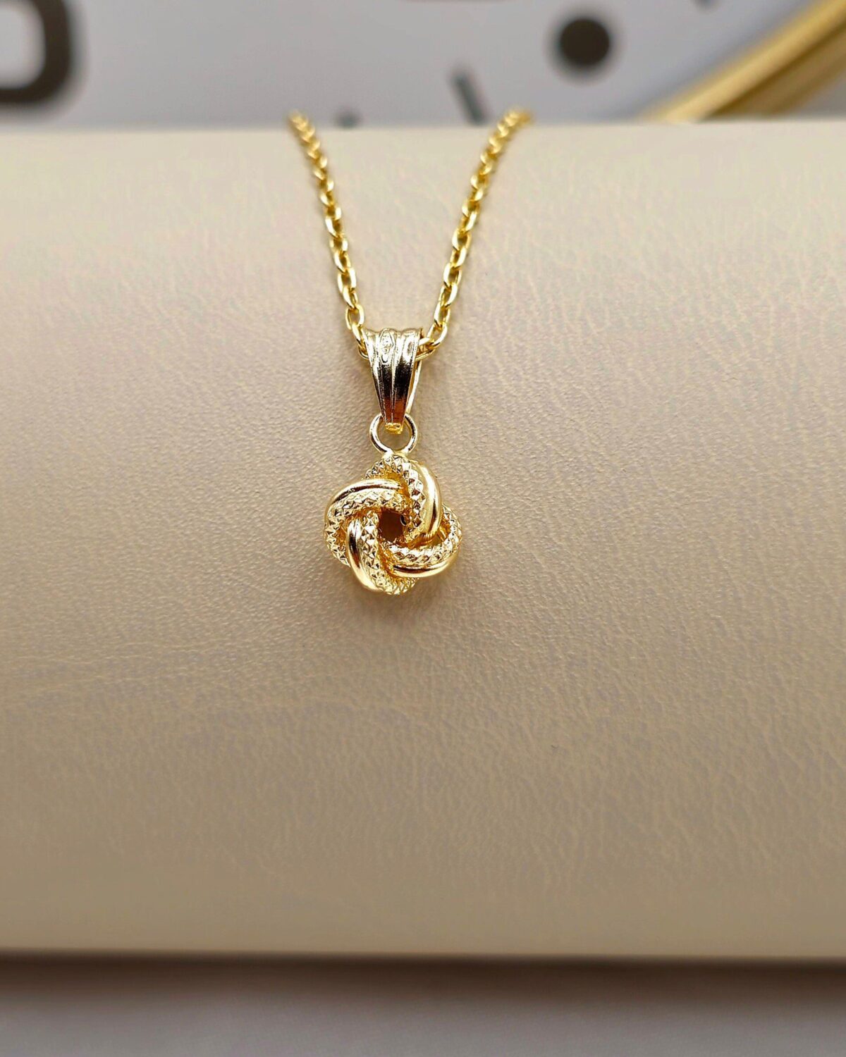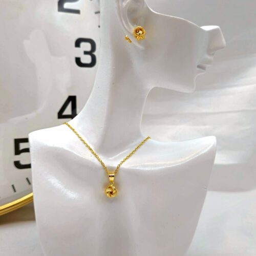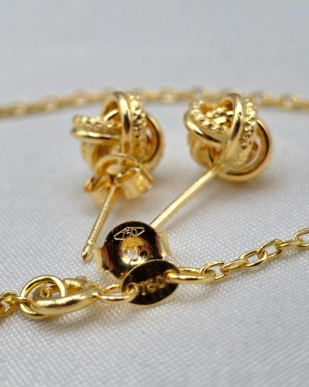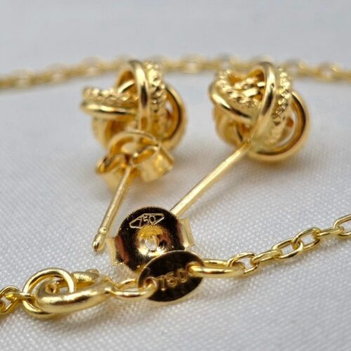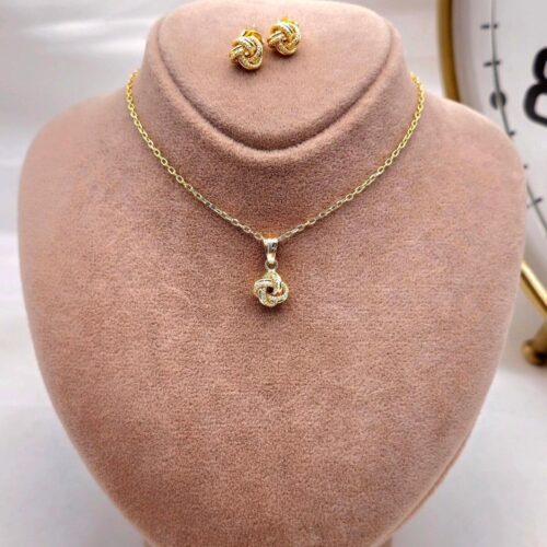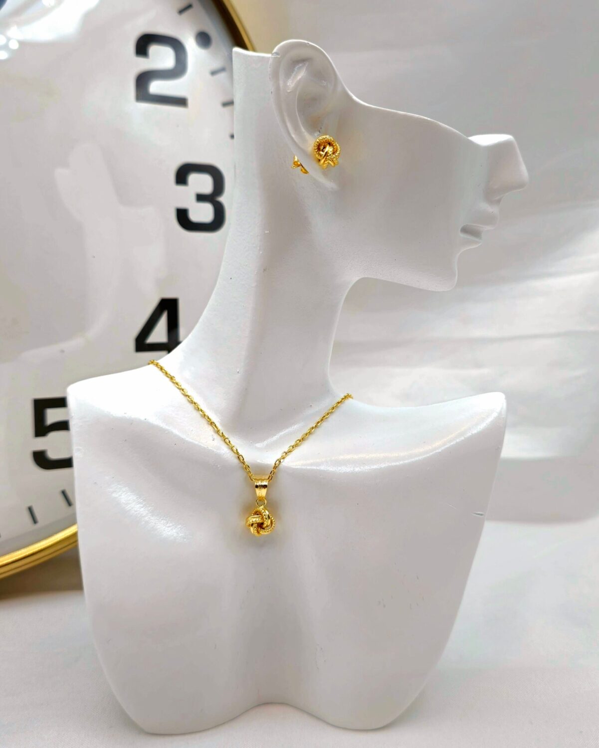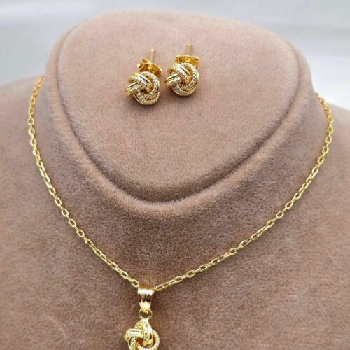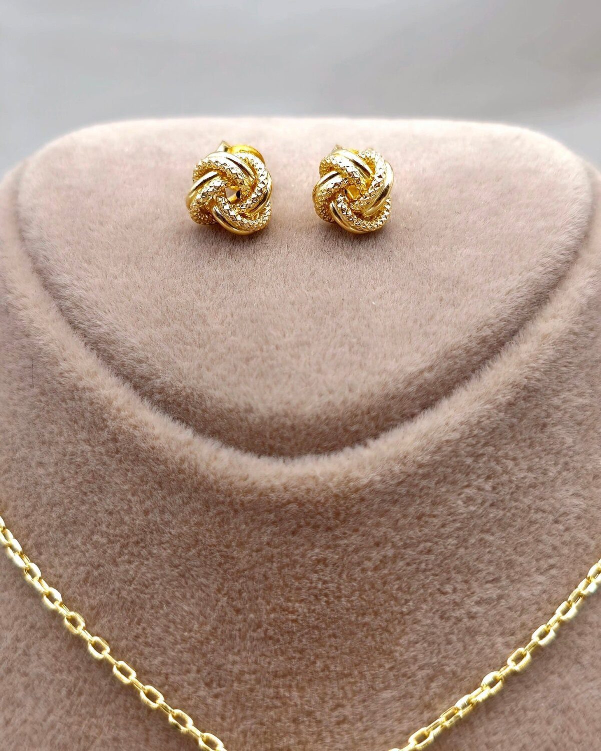 A stunning handcrafted authentic 18K gold half-set Love Knot necklace and earrings. Intricate detailing enhances the elegance of this piece, making it a beautiful and gorgeous accessory for everyday wear. A valuable gift idea for Weddings, Christmas, anniversaries, birthdays, or any occasion that deserves a touch of elegance and sophistication. The perfect gift for her! She’ll love it!