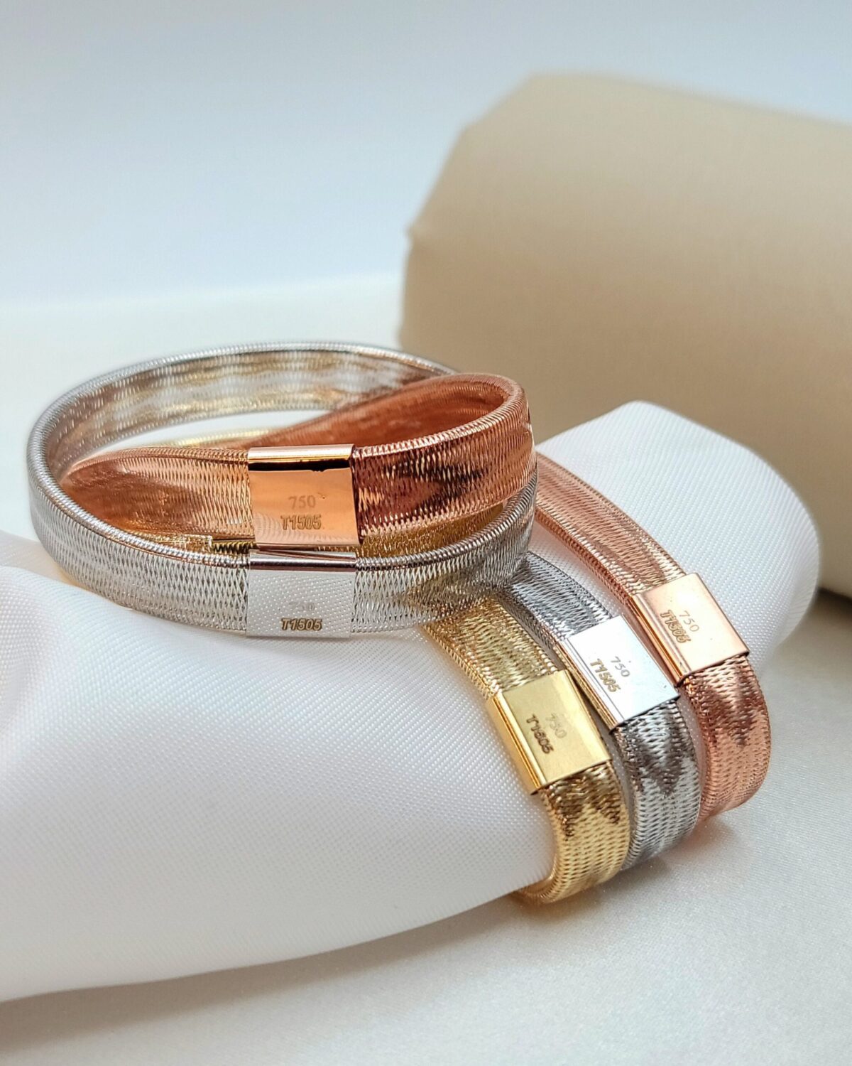At 8.5 millimeters thick, these bangle bracelets come in Rose gold, White gold, and Yellow gold.