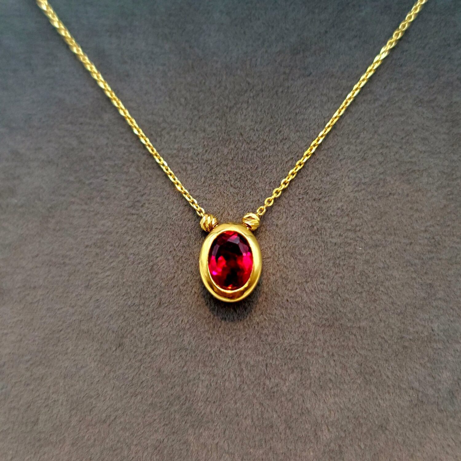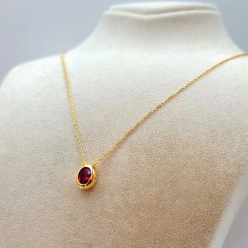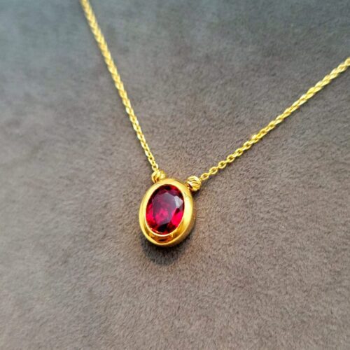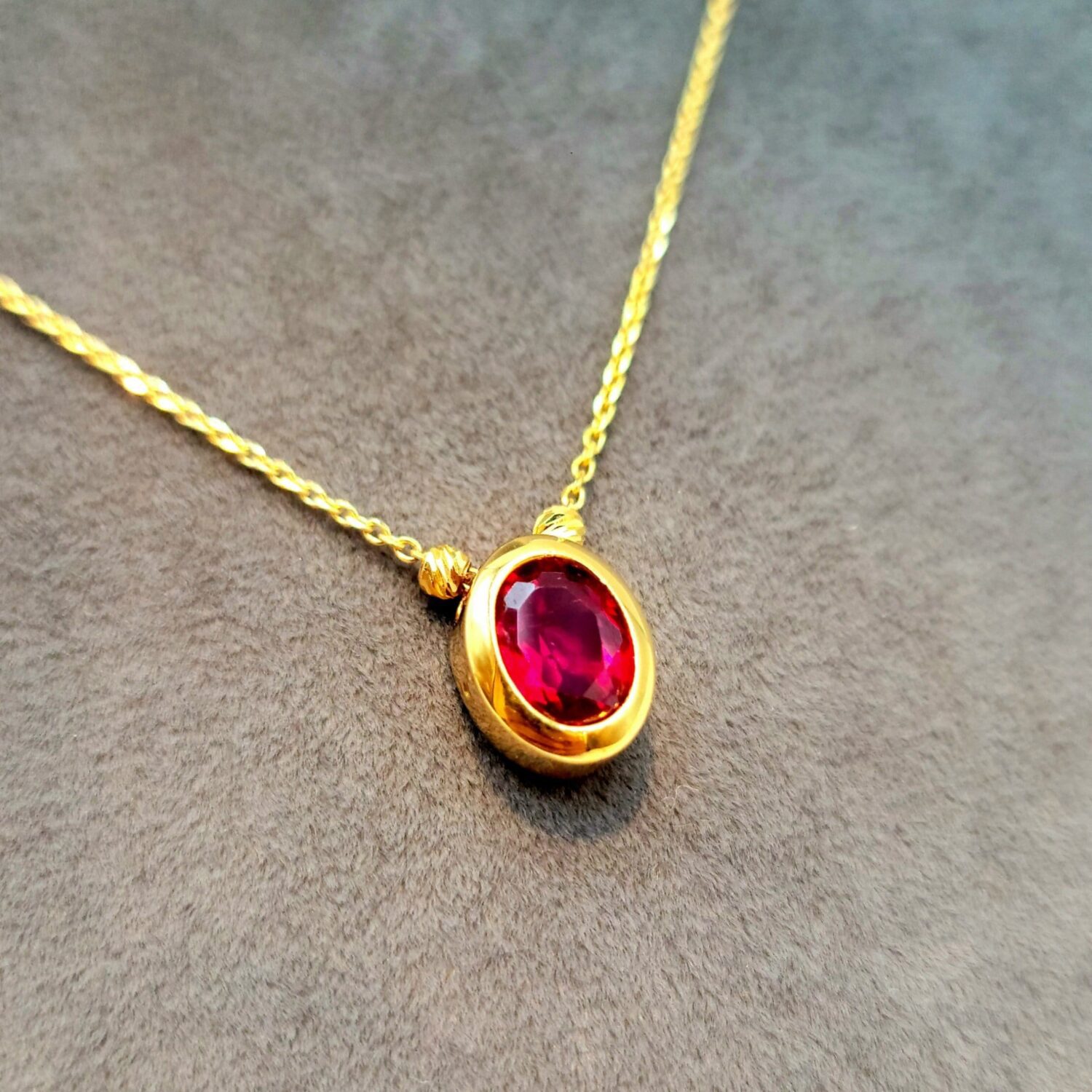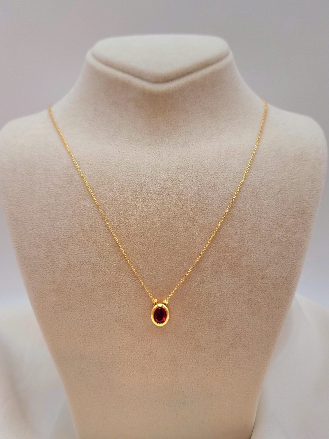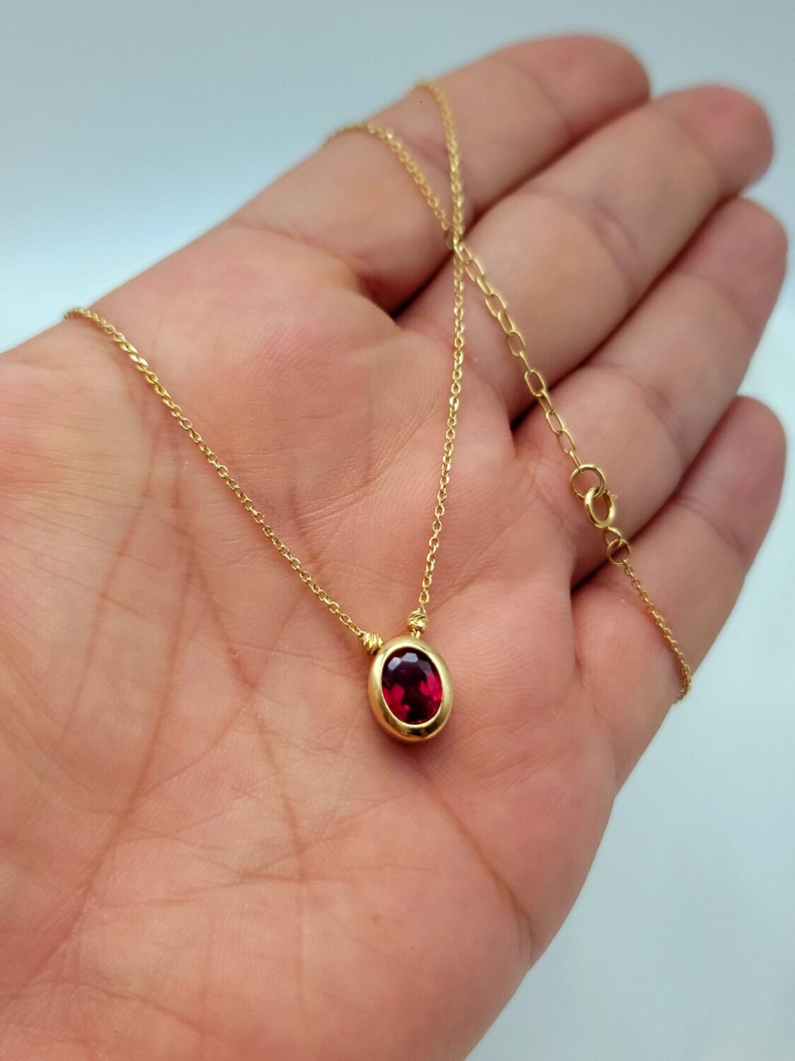 18K Solid Gold Diamond-cut Cubic Zirconia Charm Necklace, 18K Solid Gold Cable Chain, Oval Shape Red Stone Charm Necklace, Anniversary, Christmas Gift for Her/Mom!