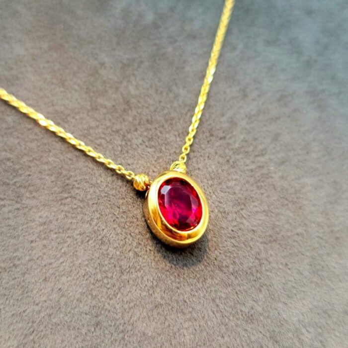 18K Solid Gold Diamond-cut Cubic Zirconia Charm Necklace, 18K Solid Gold Cable Chain, Oval Shape Red Stone Charm Necklace, Anniversary, Christmas Gift for Her/Mom!
