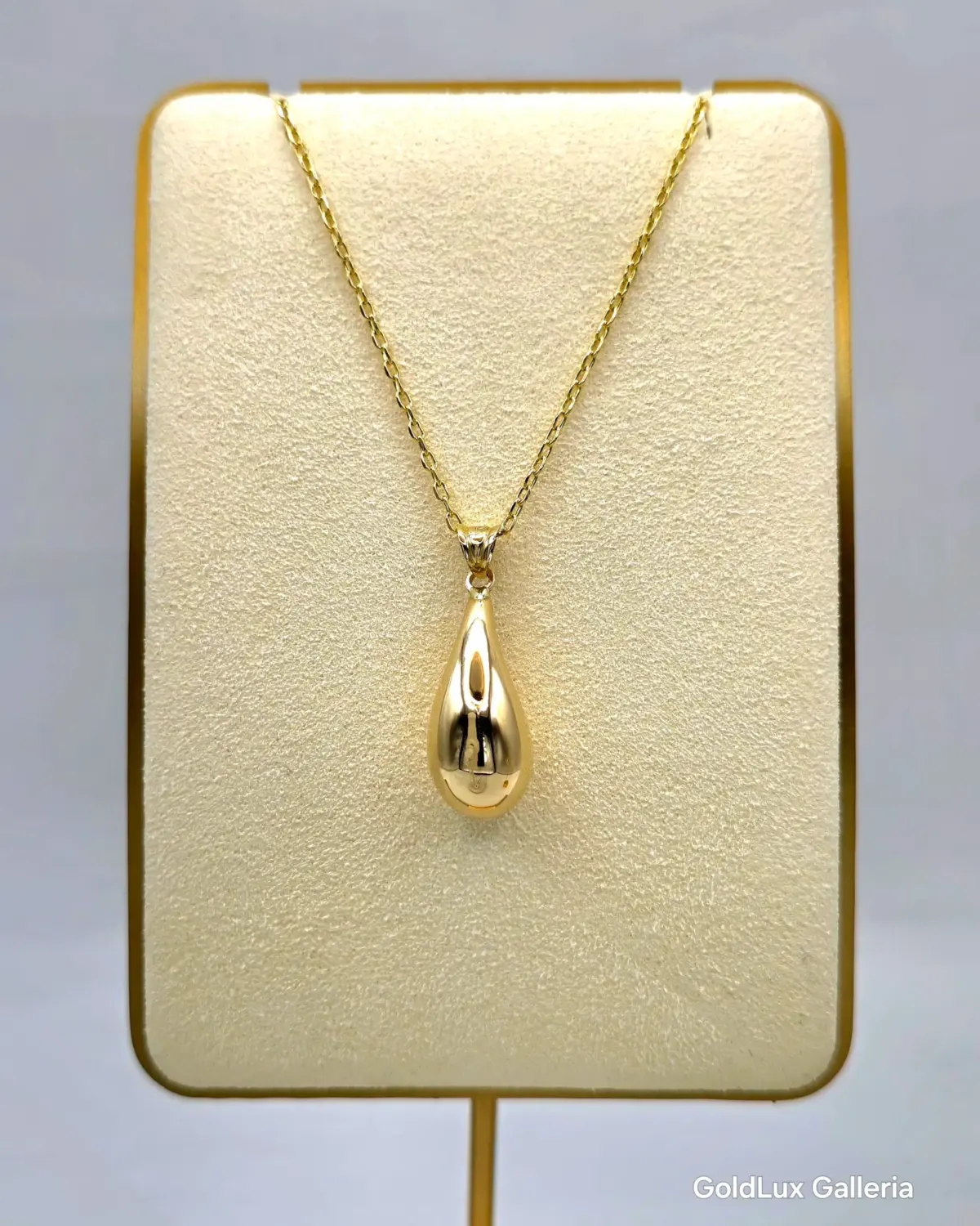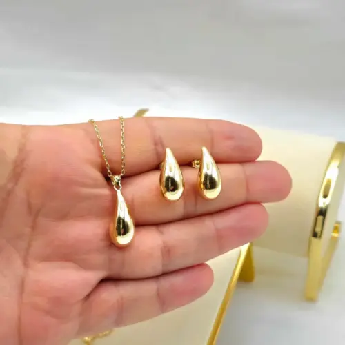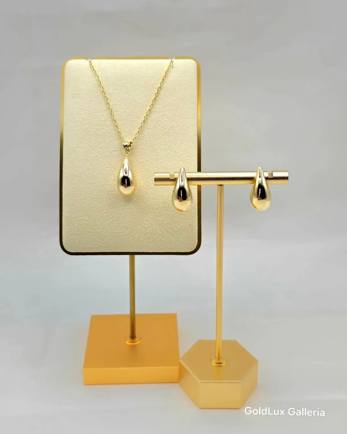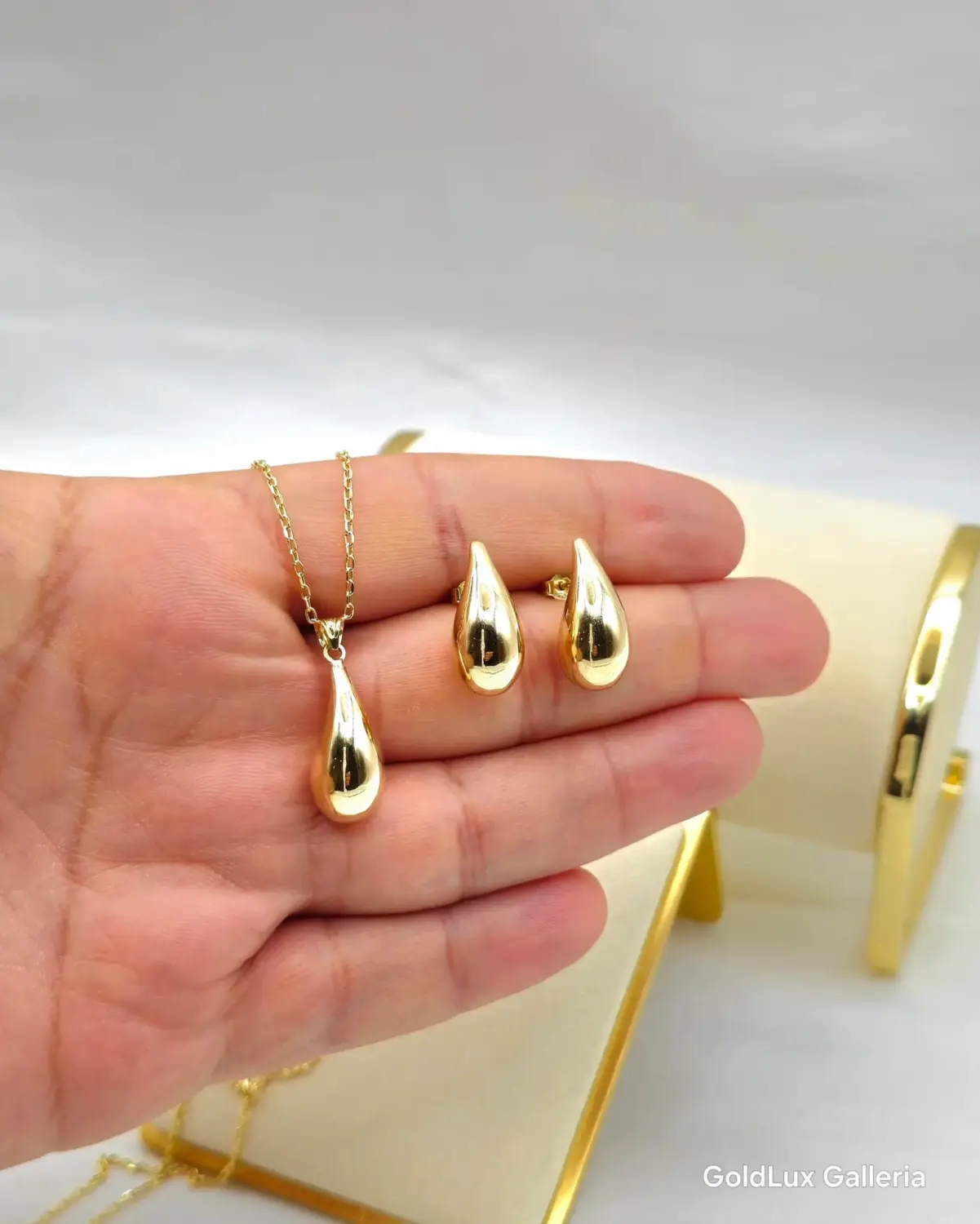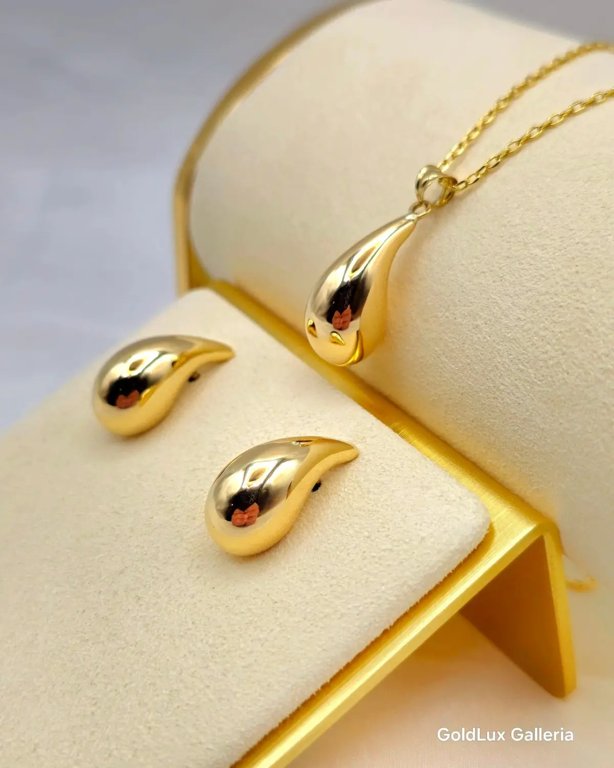 A stunning handcrafted authentic 18K gold half-set water drop (teardrop) necklace set with earrings. Intricate detailing enhances the elegance of this piece, making it a beautiful and gorgeous accessory for everyday wear. A valuable gift idea for Weddings, Christmas, anniversaries, birthdays, or any occasion that deserves a touch of elegance and sophistication. The perfect gift for her! She’ll love it!