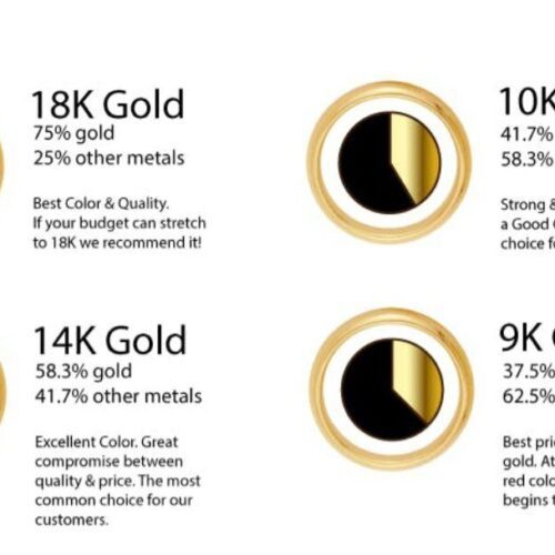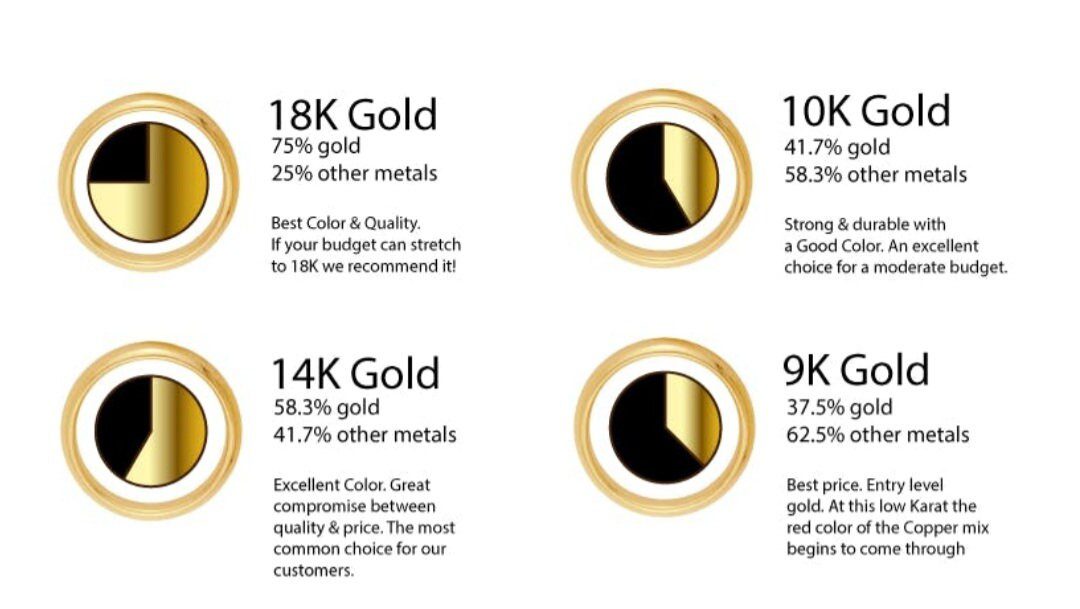 18K gold is richer and more vibrant in color. The 18k gold percentage is also less likely to trigger any skin conditions or reactions one may have because the presence of other metals and alloys is minimal.