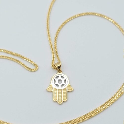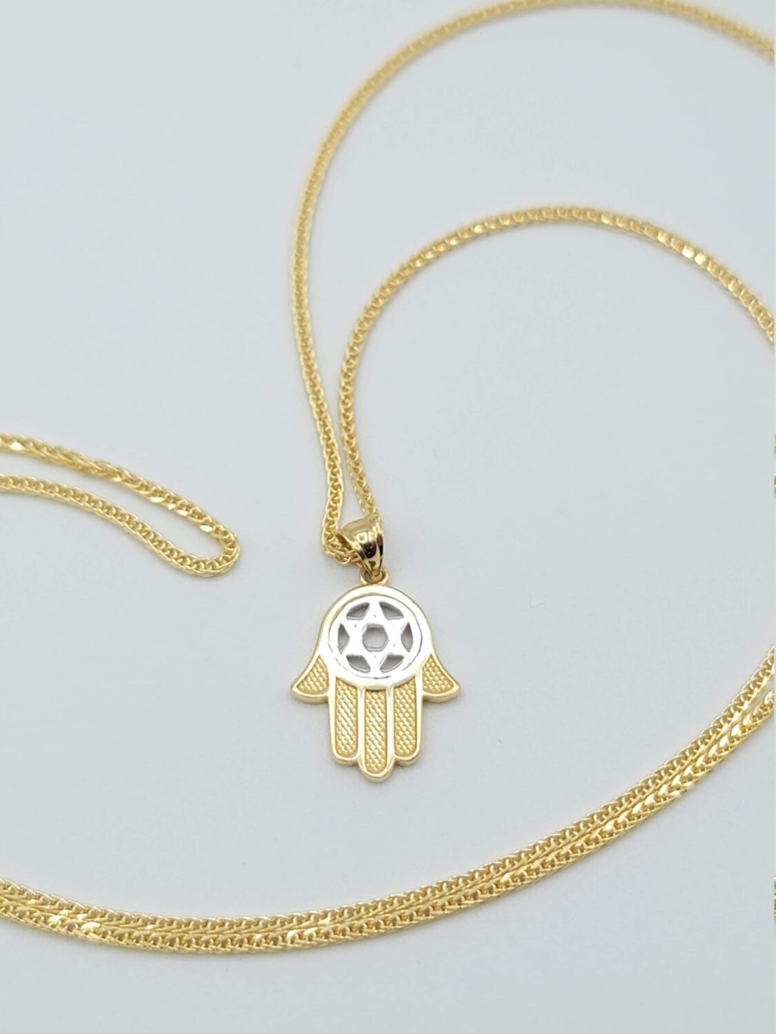 14K Solid Gold Hamsa Hand Designed With Star Of David Necklace. Foxtail Style Chain & White And Yellow Dimond Cut Pendant.