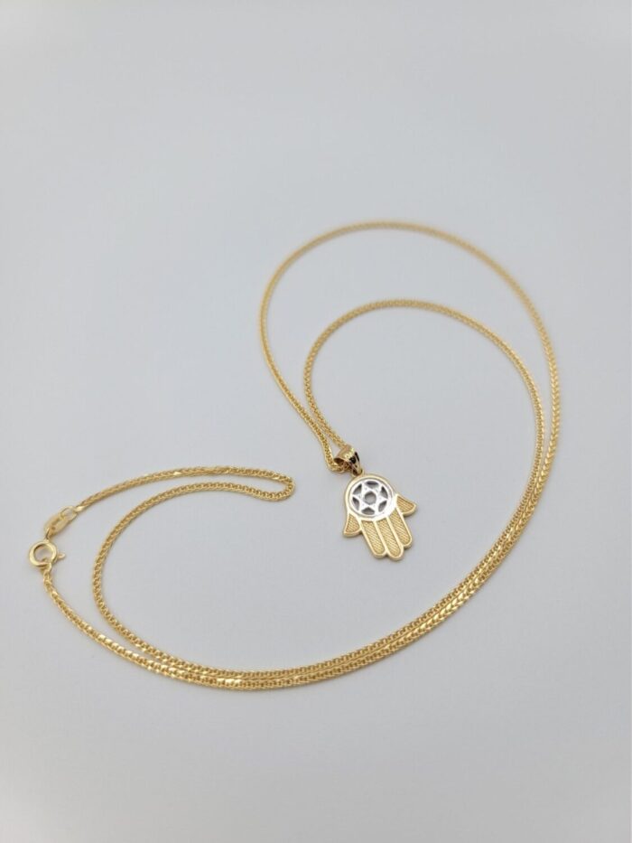 14K Solid Gold Hamsa Hand Designed With Star Of David Necklace. Foxtail Style Chain & White And Yellow Dimond Cut Pendant.