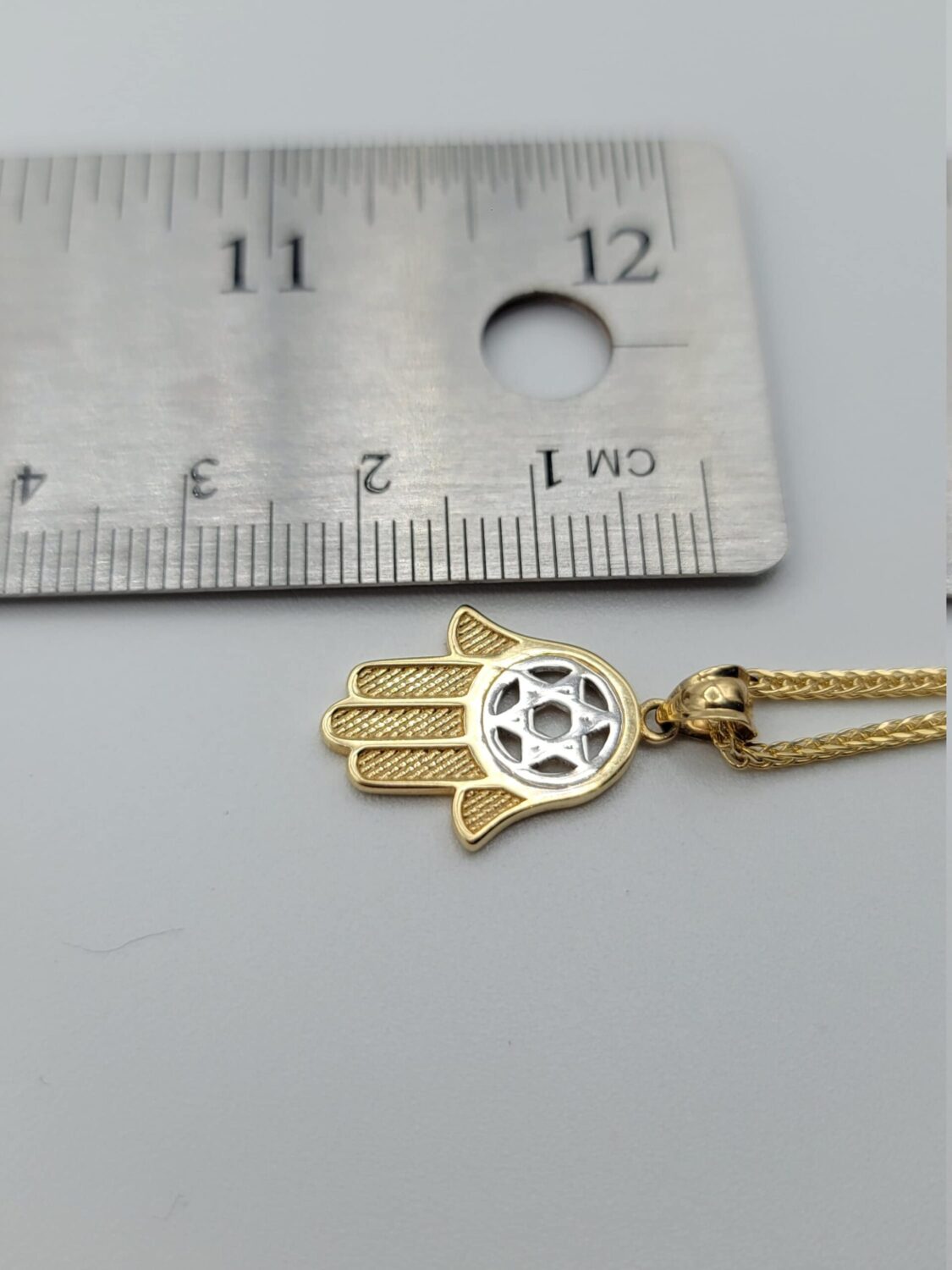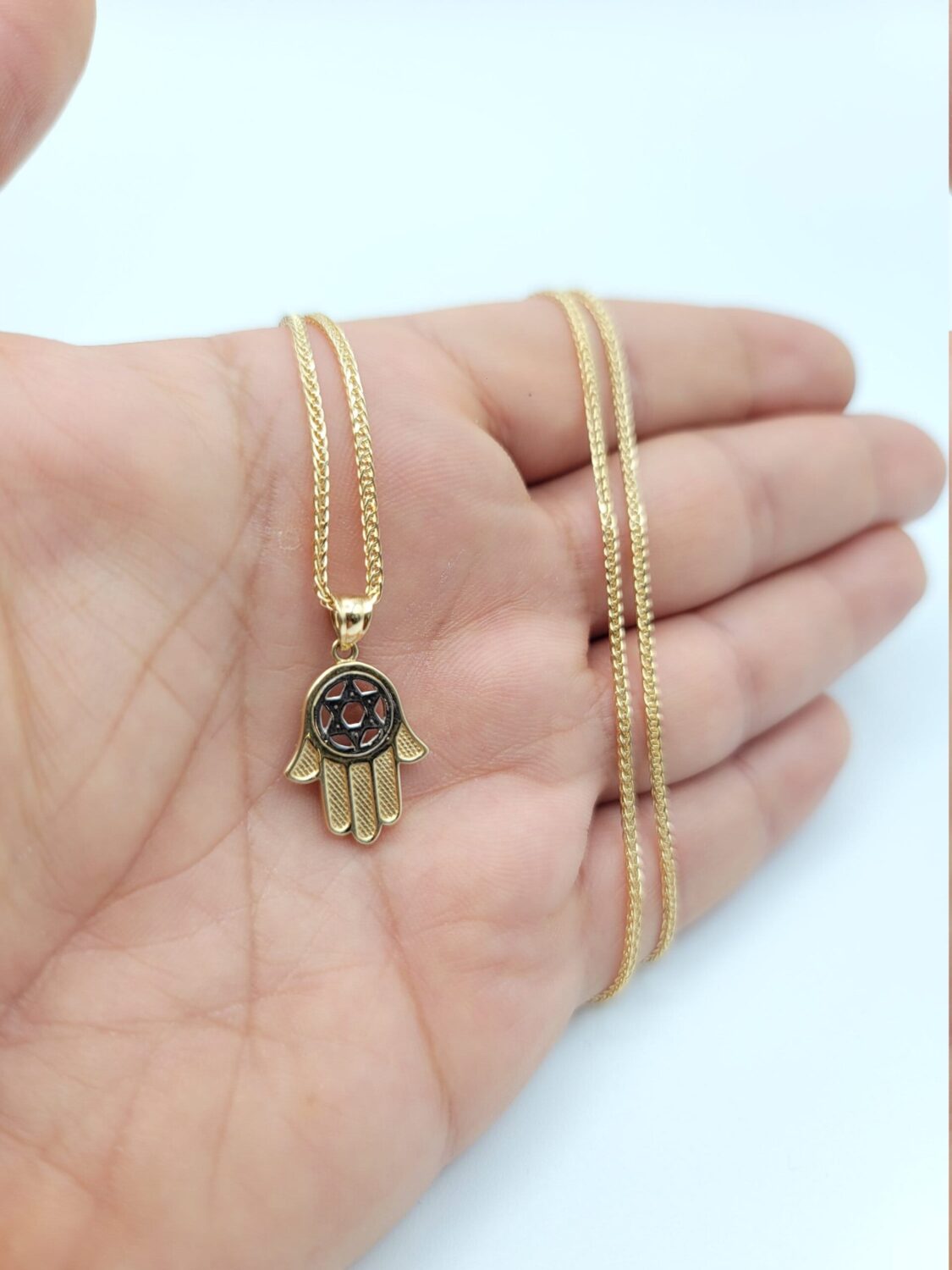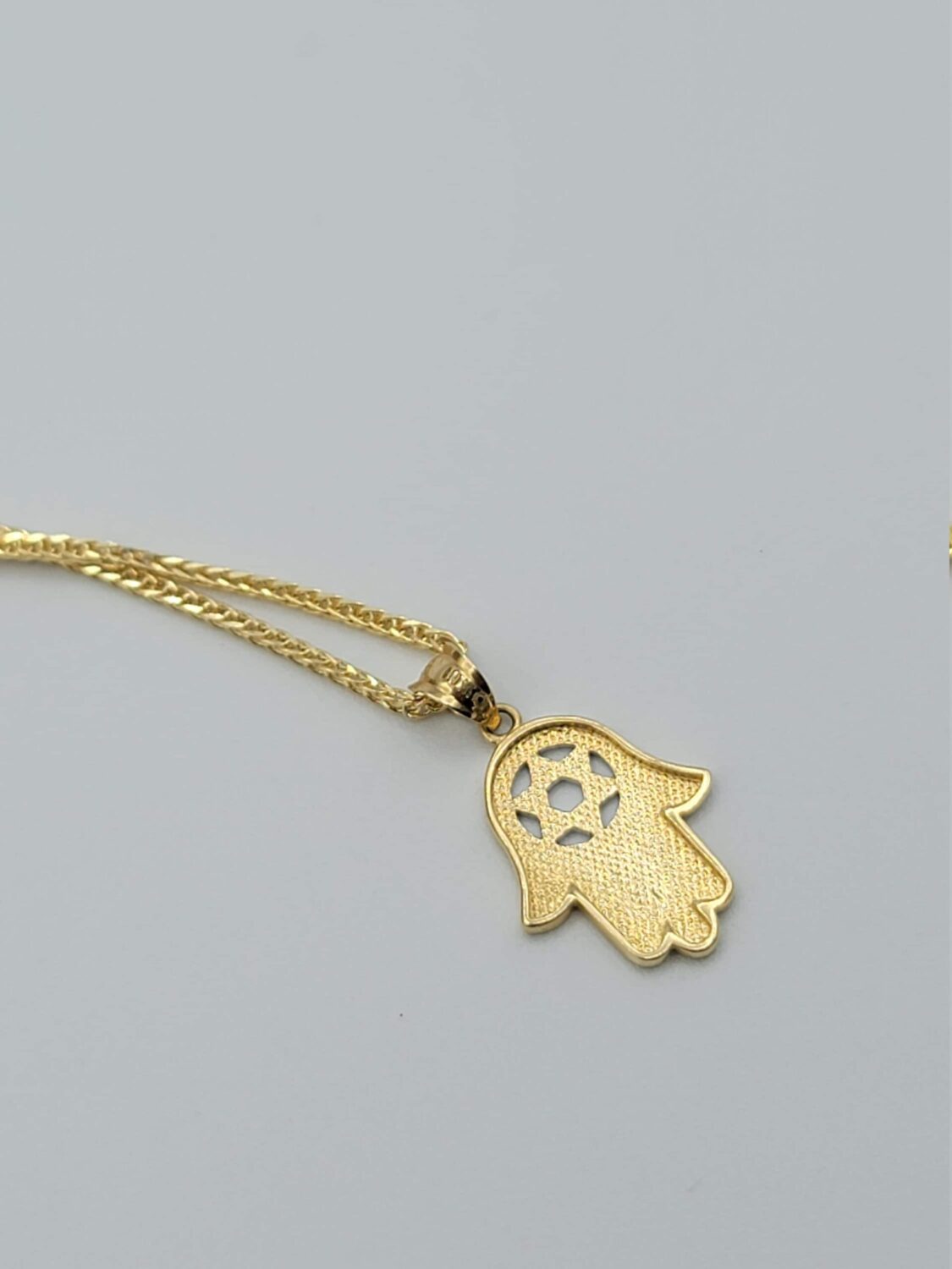 A lovely 14K Lucky Hamsa Necklace. Designed With Star Of David. Foxtail Style Chain And Dimond Cut Pendant. 3.81gr (Chain & Pendant)
