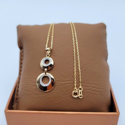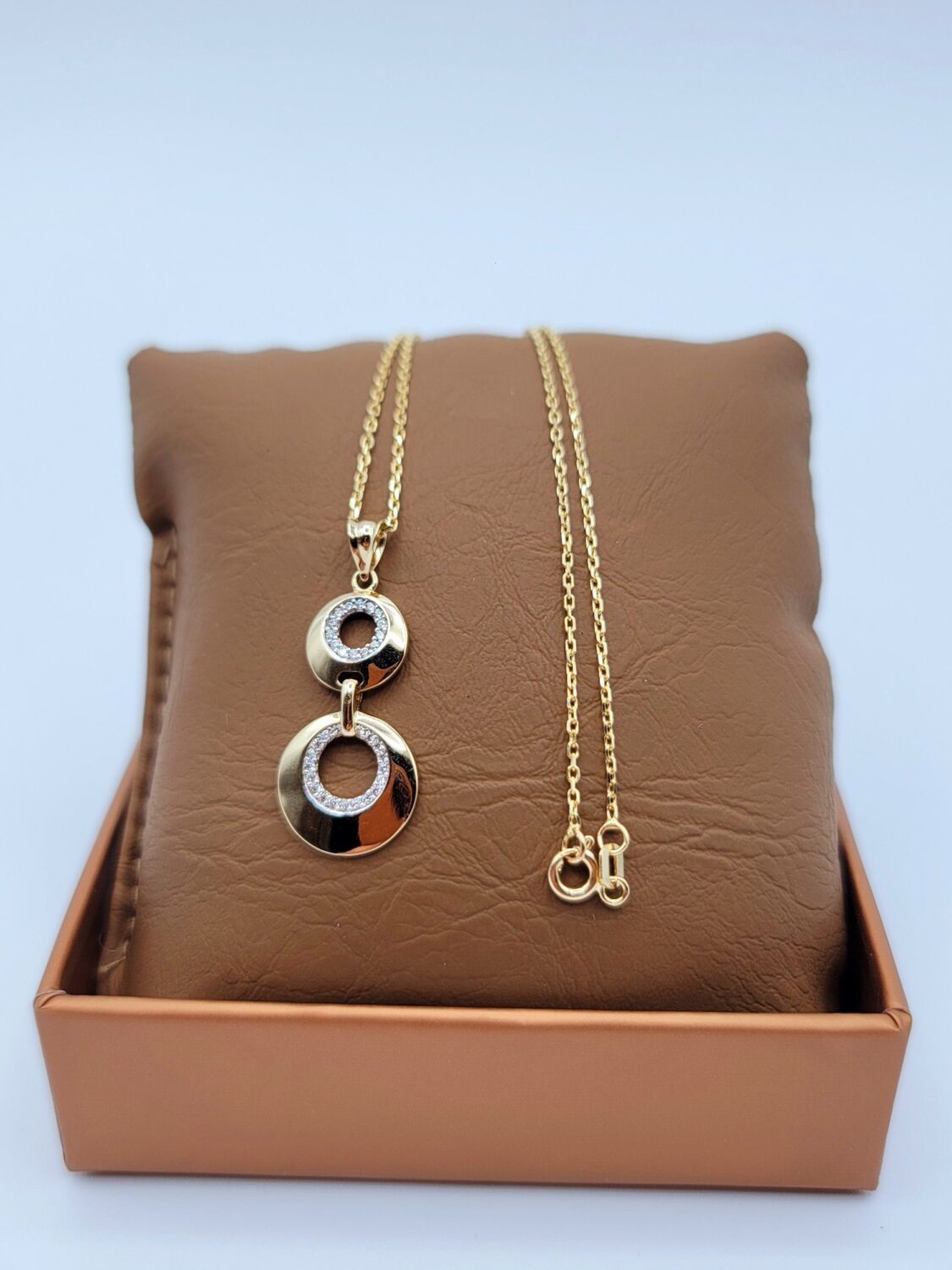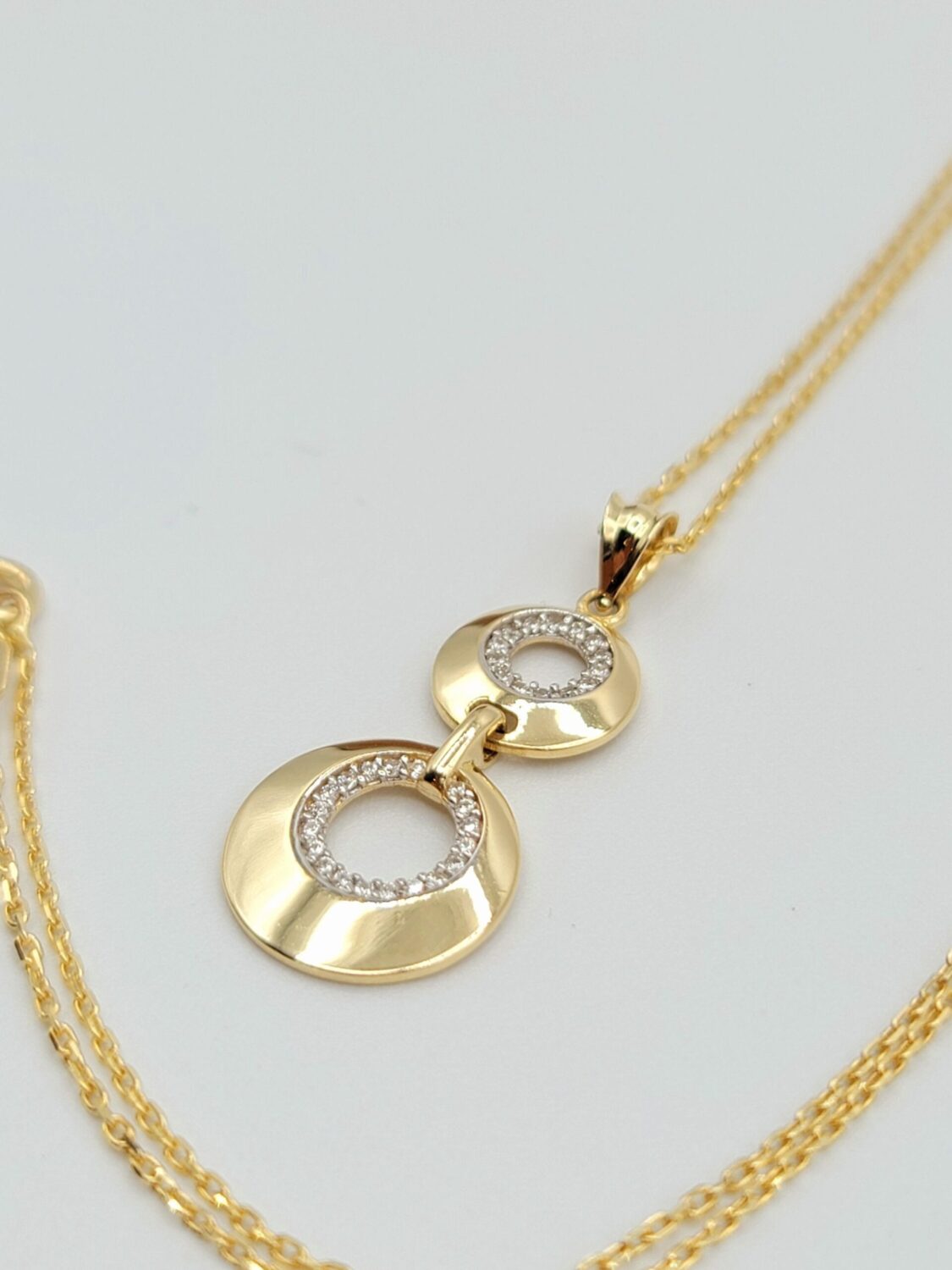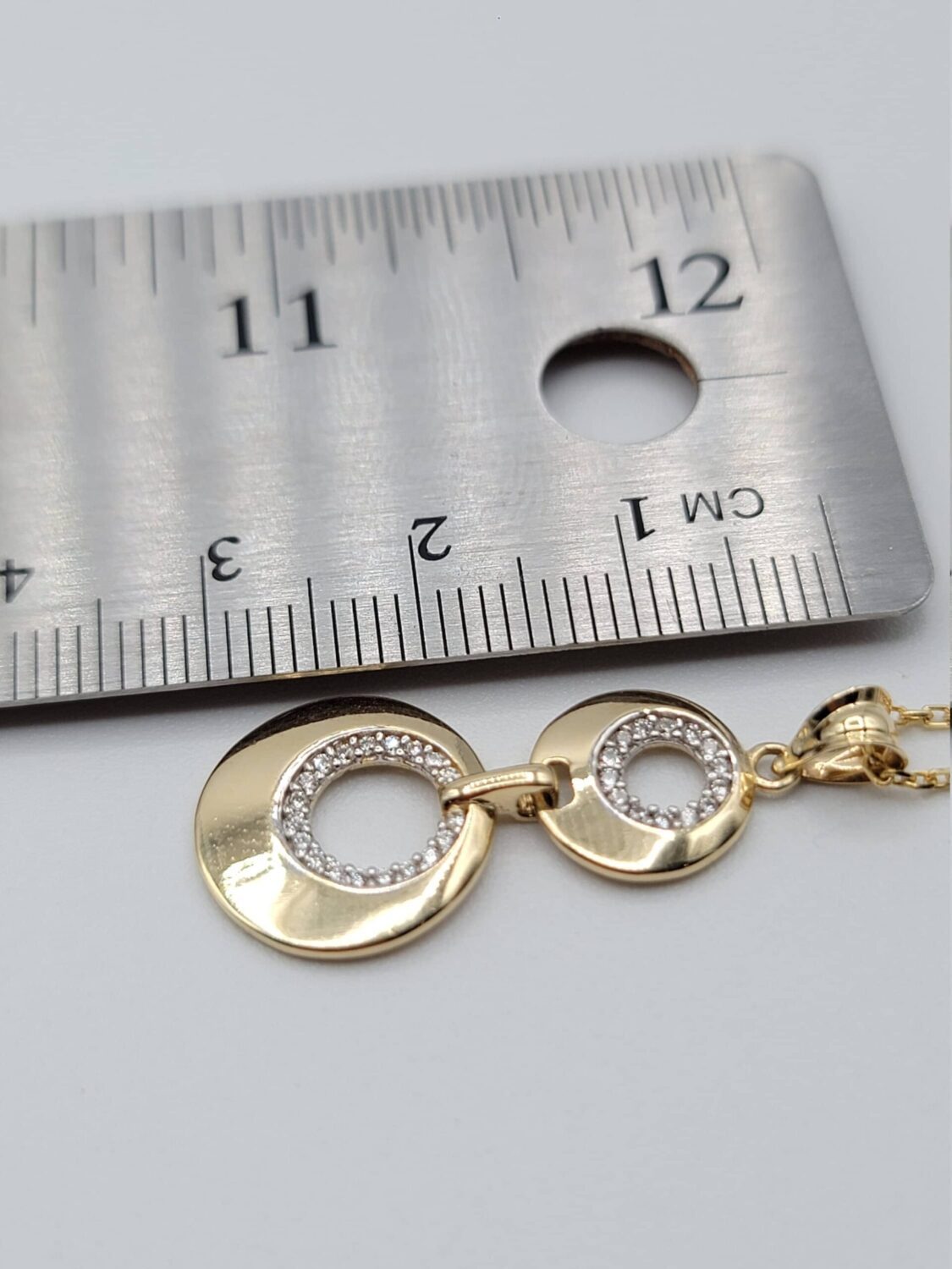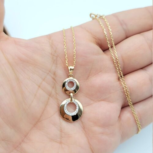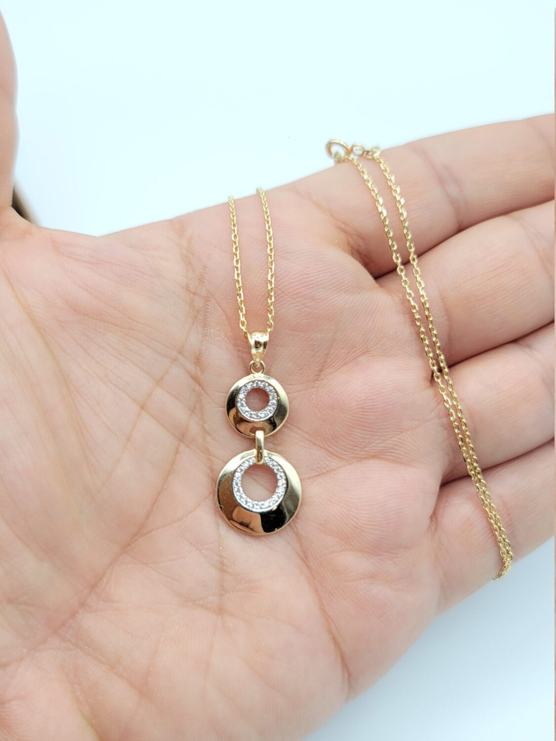14K Solid Gold Two Circle Mia Floating Necklace. Flat Cable Chain, Double Round Stone Pendant. 3.67gr (Chain & Pendant) Gift For Her!