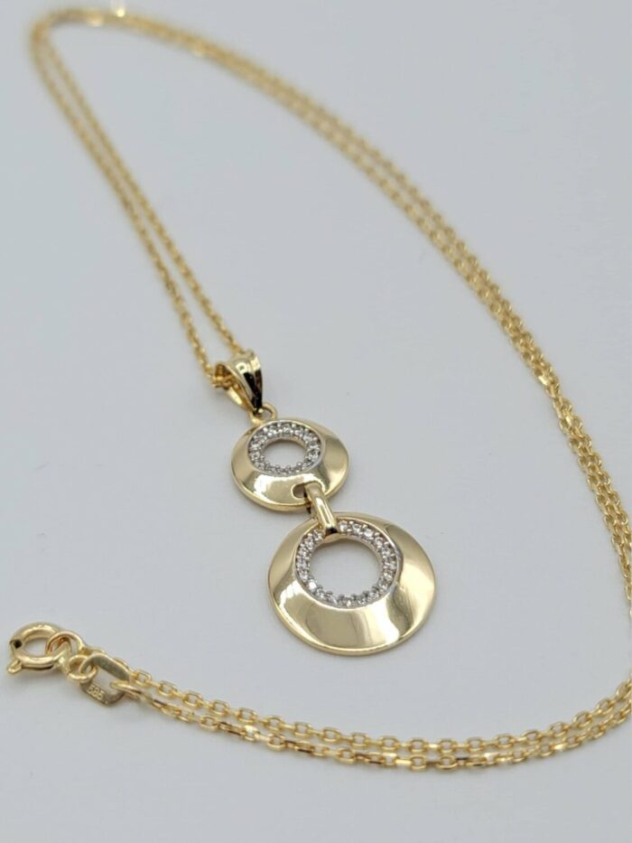 14K Solid Gold Two Circle Mia Floating Necklace. Flat Cable Chain, Double Round Stone Pendant. 3.67gr (Chain & Pendant) Gift For Her!