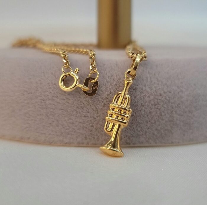 Solid 18K Instrument Necklace, 18K Yellow Gold Trumpet Music Charm Pendant Necklace, Unisex Sax Jazz Instrument Necklace, 18Krt Rolo Chain.